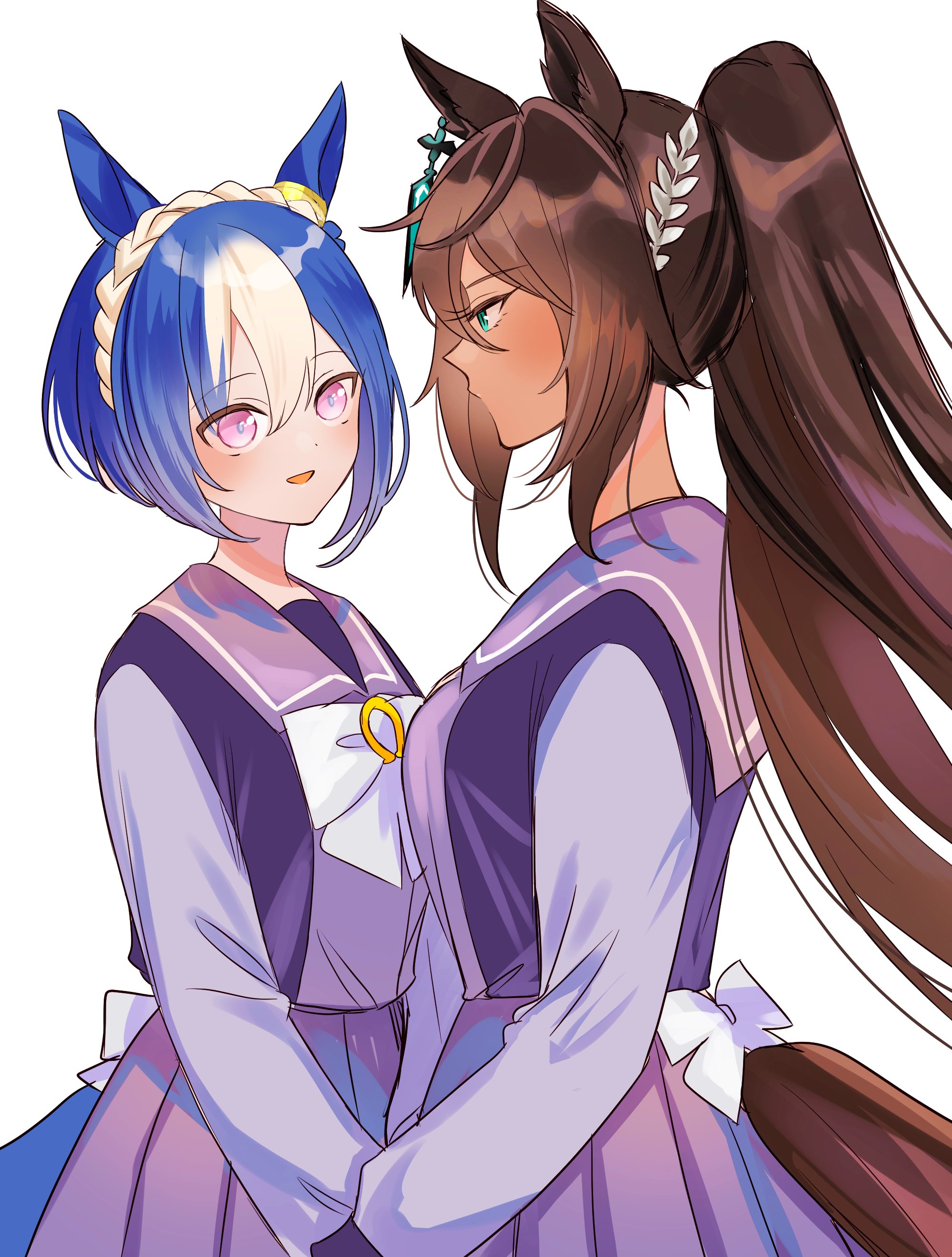 2girls absurdres animal_ears blue_eyes blue_hair blush bow bowtie braid breasts brown_hair cesario_(umamusume) closed_mouth commentary_request crown_braid dark-skinned_female dark_skin earrings hair_between_eyes highres horse_ears horse_girl horse_tail jewelry long_hair long_sleeves mosu2 multicolored_hair multiple_girls open_mouth pleated_skirt ponytail purple_eyes purple_sailor_collar purple_serafuku purple_shirt purple_skirt sailor_collar sailor_shirt school_uniform serafuku shirt short_hair simple_background single_earring skirt smile symboli_kris_s_(umamusume) tail tracen_school_uniform umamusume umamusume_horse_relations white_bow white_bowtie white_hair