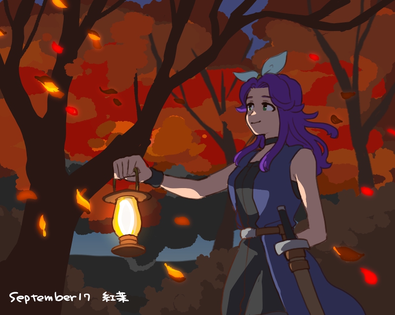 1girl abigail_(stardew_valley) arm_behind_back black_choker bow choker closed_mouth commentary_request green_bow green_eyes hair_bow holding holding_lantern lantern long_hair looking_up maruo_(ciao15) purple_hair smile solo stardew_valley sword tree weapon