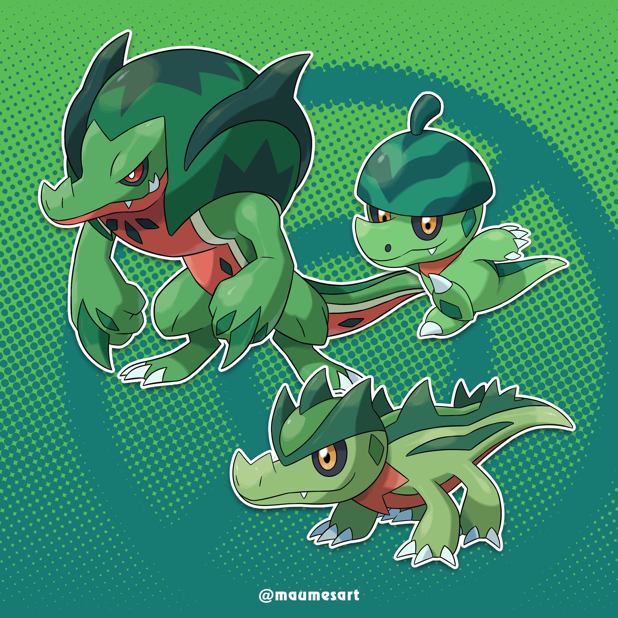 black_sclera brown_eyes colored_sclera colored_skin crocodilian evolutionary_line fakemon green_background green_skin highres maumesart nintendo no_humans original outline poke_ball_background pokemon pokemon_(creature) red_eyes sugimori_ken_(style) two-tone_background white_outline
