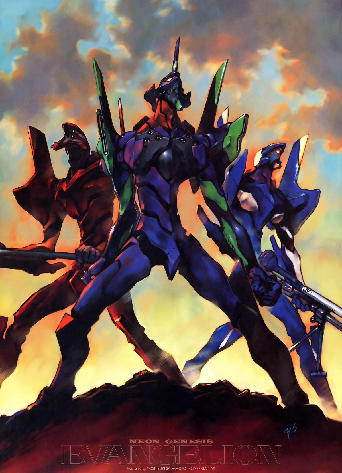 eva_00 eva_01 eva_02 evangelion_(mecha) extra_eyes green_eyes highres holding holding_weapon horns mecha mecha_focus neon_genesis_evangelion no_humans official_art one-eyed red_eyes robot sadamoto_yoshiyuki science_fiction single_horn standing super_robot weapon