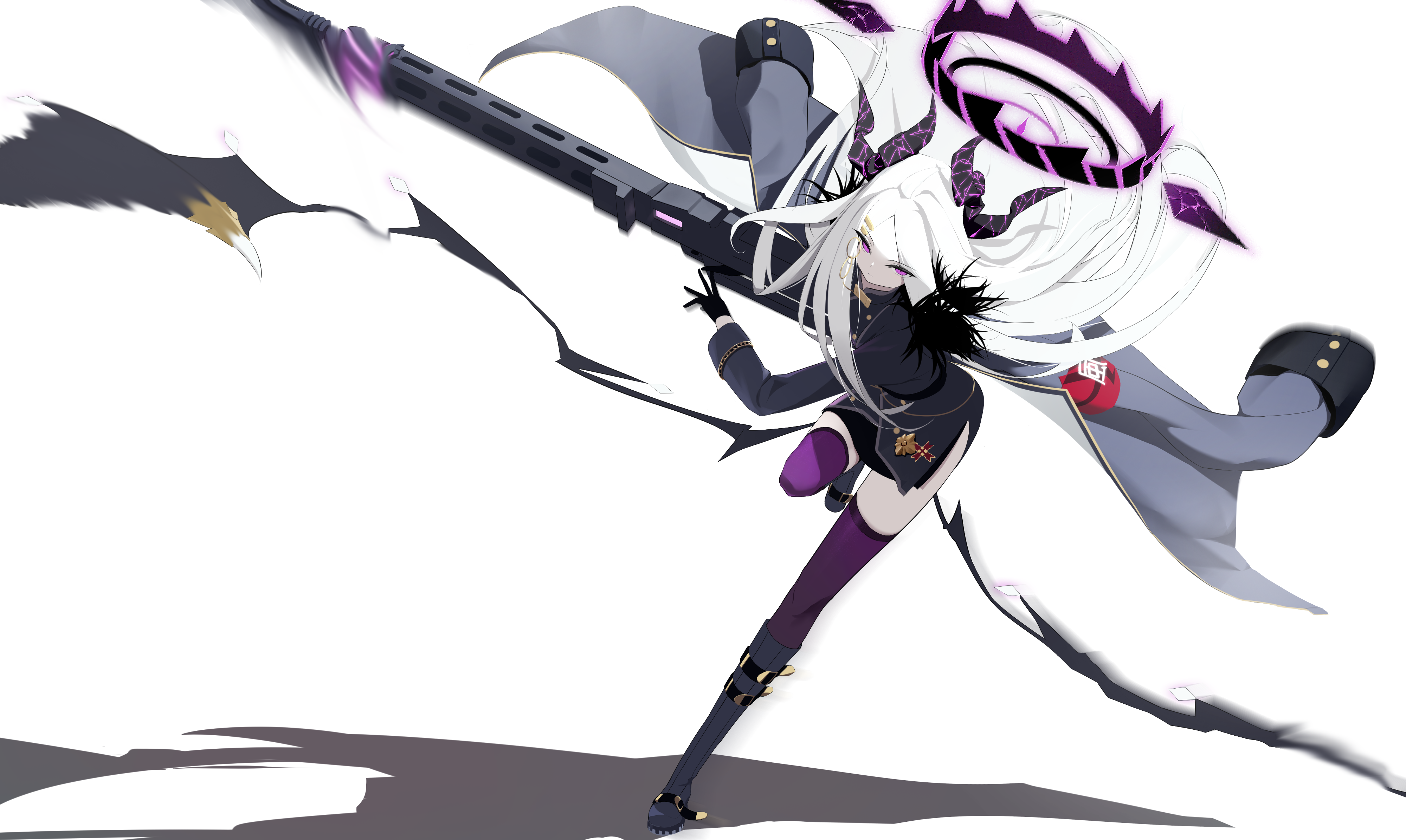 11haguki 1girl absurdres ahoge armband black_coat black_skirt blue_archive coat coat_on_shoulders commentary_request demon_girl demon_horns demon_wings gun highres hina_(blue_archive) holding holding_gun holding_weapon horns long_hair looking_at_viewer low_wings machine_gun mg42 purple_eyes purple_thighhighs red_armband simple_background skirt solo thighhighs weapon white_background white_hair wings