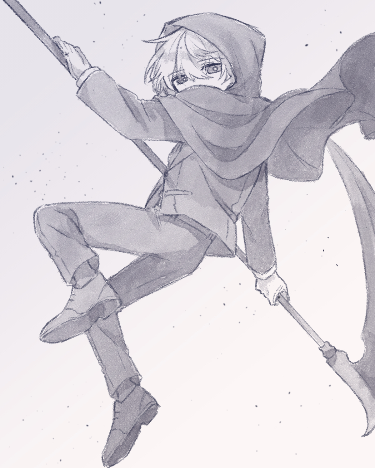1boy bright_pupils cloak commentary_request covered_mouth suit_pants dress_shoes formal_clothes gloves greyscale highres holding holding_scythe hood hood_up hooded_cloak jacket knee_up kuchinashi_dabi leg_up looking_at_viewer mimi_utlove monochrome oshi_no_taisetsuna_hito_ni_narikawaru scythe short_hair solo suit suit_jacket