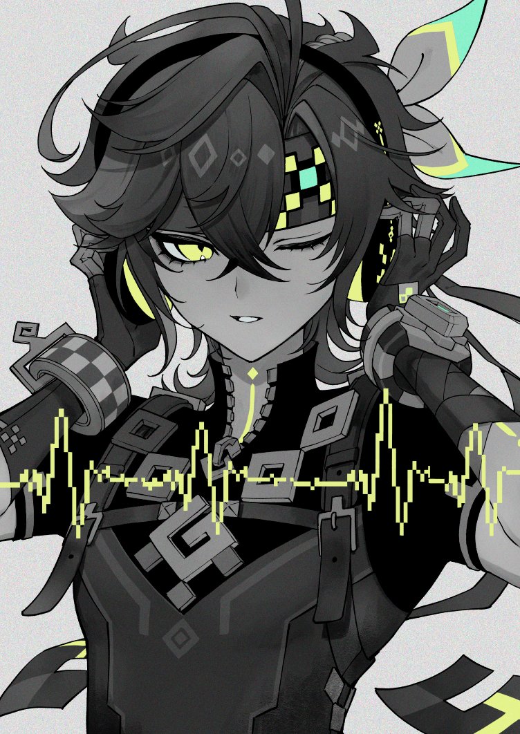 1boy crossed_bangs genshin_impact gloves hair_between_eyes headband headphones kinich_(genshin_impact) listening_to_music looking_at_viewer lower_eyelashes_only male_focus monochrome one_eye_closed parted_lips shirt short_sleeves simple_background solo spot_color tabidachinimiz upper_body yellow_eyes