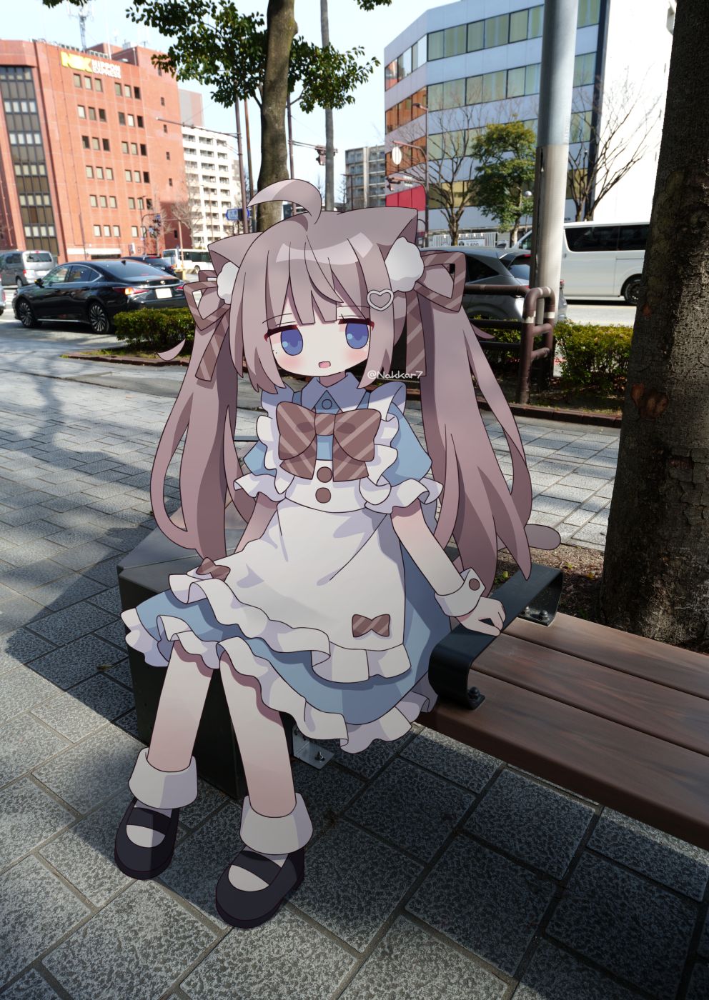 1girl ahoge animal_ear_fluff animal_ears apron artist_name black_shoes blue_dress blue_eyes bow bowtie brown_bow brown_bowtie brown_hair brown_ribbon car cat_ears cat_girl commentary day diagonal-striped_bow diagonal-striped_bowtie diagonal-striped_clothes diagonal-striped_ribbon dress frilled_apron frills hair_ornament hair_ribbon heart heart_hair_ornament highres long_hair looking_at_viewer motor_vehicle nakkar open_mouth original outdoors photo_background puffy_short_sleeves puffy_sleeves ribbon shoes short_sleeves sitting socks solo striped_bow striped_bowtie striped_clothes tree twintails twitter_username white_apron white_socks white_wrist_cuffs wrist_cuffs