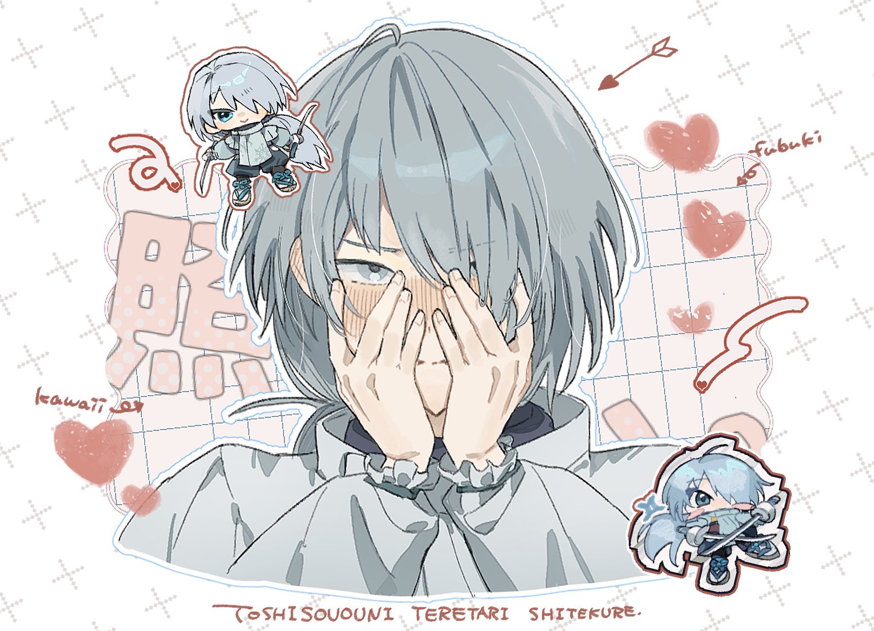 1boy 6_6udon ahoge arrow_(projectile) arrow_(symbol) asymmetrical_bangs blue_eyes blue_hakama blue_outline blush blush_stickers character_name chibi chibi_inset closed_mouth covering_own_face dual_wielding ear_blush embarrassed frilled_sleeves frills fubuki_(nige_jouzu_no_wakagimi) furrowed_brow grey_eyes grey_hair grid_background hair_between_eyes hair_over_one_eye hakama hands_up heart highres holding holding_sword holding_weapon japanese_clothes katana long_hair long_sleeves looking_at_viewer low_ponytail male_focus nige_jouzu_no_wakagimi nose_blush one_eye_covered outline ponytail puffy_pants sandals smile snowflake_print sparkle straight-on sword tabi upturned_eyes v-shaped_eyebrows weapon wolf_cut zouri