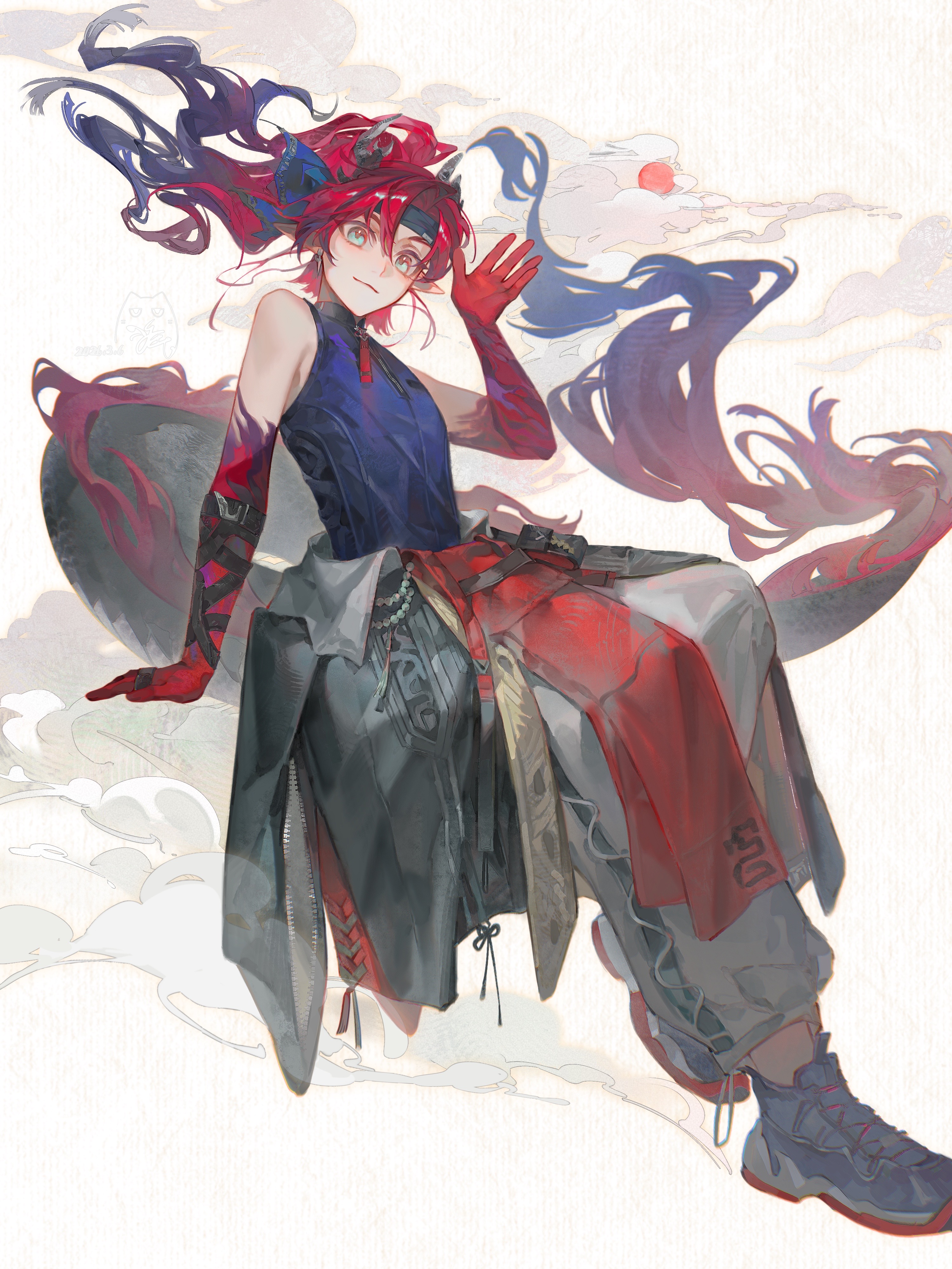 1boy absurdres arknights arm_tattoo bare_shoulders black_shoes blue_shirt chinese_commentary colored_extremities colored_skin commentary_request dragon_boy dragon_horns dragon_tail full_body fur-tipped_tail green_eyes grey_pants hand_up highres horns invisible_chair looking_at_viewer male_focus pants red_hair red_skin shirt shoes simple_background sitting sleeveless sleeveless_shirt smile sneakers solo tail tattoo waving white_background you_yeyou0904 yu_(arknights)