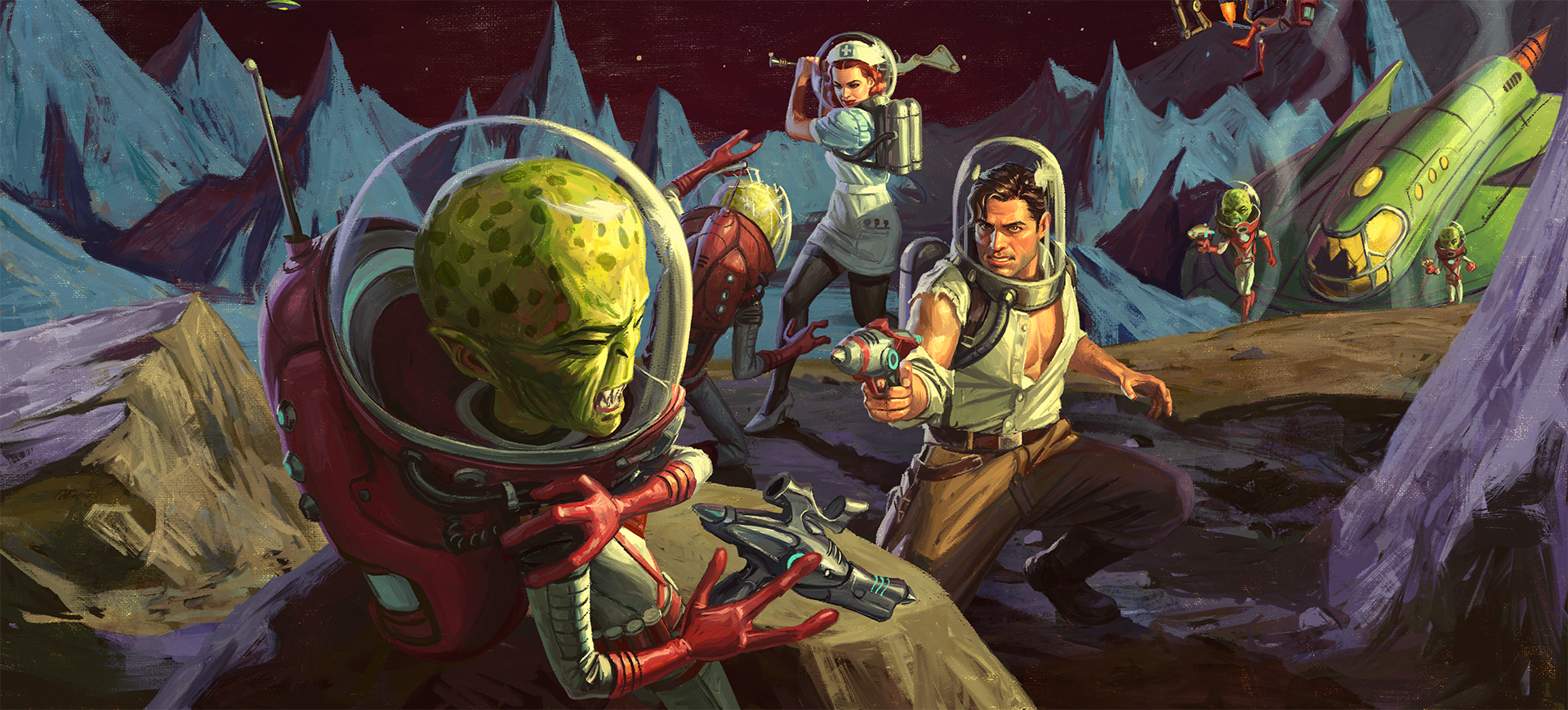 1girl 5boys alien black_pantyhose blue_shirt boots brown_boots brown_hair brown_pants colored_skin dress energy_gun fallout fallout_76 green_skin gun hat highres holding holding_gun holding_weapon mountainous_horizon multiple_boys nurse_cap official_art pants pantyhose ray_gun red_hair shirt sleeveless sleeveless_dress spacecraft weapon white_dress white_shirt