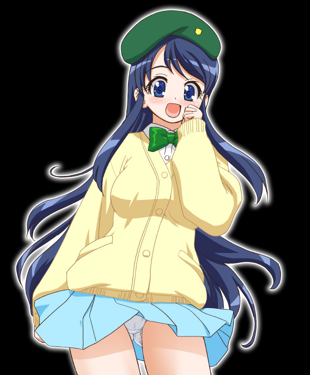 00s 1girl aged_down black_background bow cowboy_shot female_focus gambler_club green_hat hat panties pantyshot simple_background skirt solo standing sweater umegae_naomi underwear zettai_karen_children