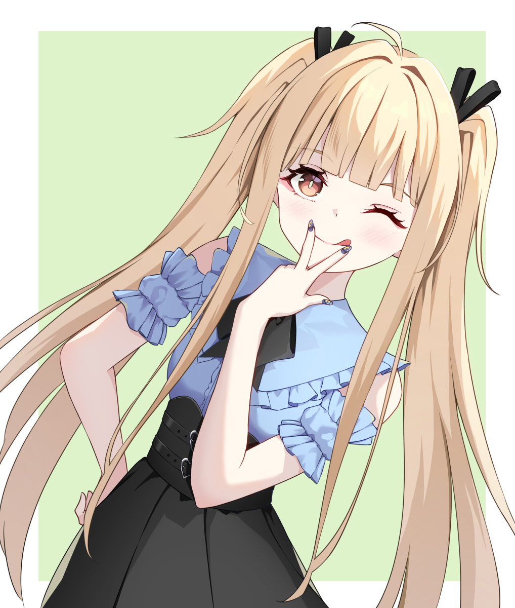 1girl ahoge black_bow black_bowtie black_ribbon black_skirt blonde_hair blue_shirt blush border bow bowtie brown_eyes cho_kaguya-hime! commentary_request detached_sleeves frilled_shirt frills green_background hair_ribbon highres jirai_kei kaguya_(cho_kaguya-hime!) kituneiyori0122 long_hair looking_at_viewer nail_polish one_eye_closed outside_border partial_commentary ribbon shirt sidelocks simple_background skirt solo tongue tongue_out twintails w w_over_mouth white_border