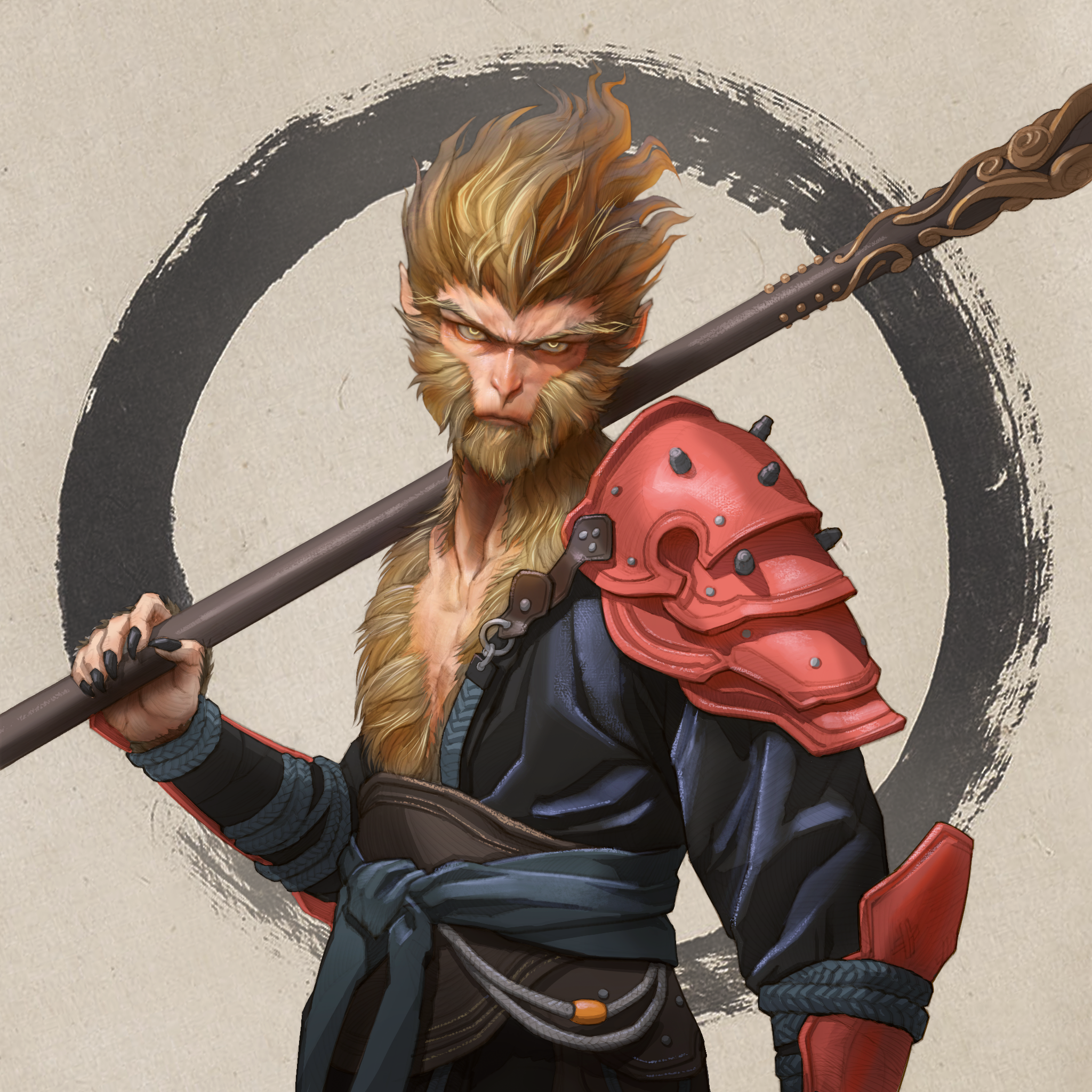 1boy armor beard black_myth:_wukong black_nails black_shirt blonde_hair bmwsb0 bo_staff body_fur check_commentary chest_fur chinese_armor chinese_clothes chinese_commentary closed_mouth commentary_request facial_hair fingernails furry furry_male glowing glowing_eyes highres holding holding_staff holding_weapon ink long_eyebrows looking_at_viewer mixed-language_commentary monkey_boy off_shoulder over_shoulder pointy_ears red_armor rope ruyi_jingu_bang serious sharp_fingernails shirt short_hair shoulder_armor solo staff sun_wukong upper_body v-shaped_eyebrows vambraces weapon weapon_over_shoulder yellow_eyes yellow_fur