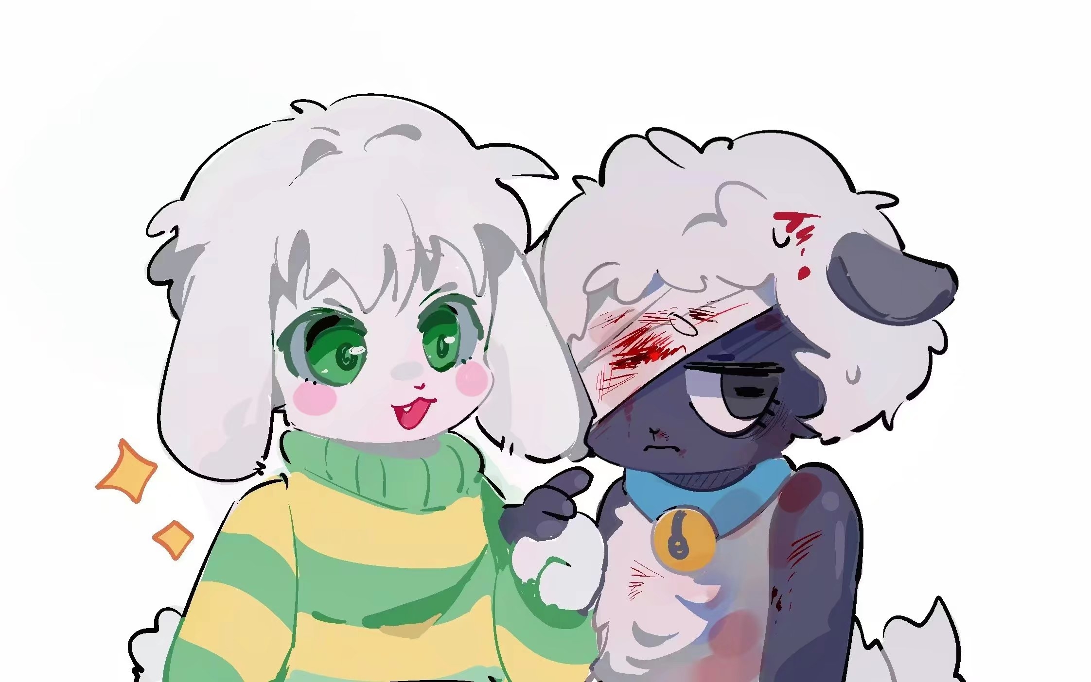 2boys 3: :3 :d amanda_the_adventurer arm_at_side asriel_dreemurr bandage_over_one_eye bell black_eyes blood blood_on_face blue_choker blush breasts choker cleavage colored_eyelashes crossover face-to-face facing_another fang fewer_digits frown furry furry_male goat_boy green_eyes green_sweater hand_up highres horizontal_pupils jingle_bell jitome long_sleeves looking_at_another looking_at_viewer male_focus multiple_boys neck_bell one_eye_covered open_mouth puffy_long_sleeves puffy_sleeves sheep_boy sideways_glance simple_background smile sparkle striped_clothes striped_sweater sweater tail tareme tongue trait_connection turtleneck turtleneck_sweater two-tone_sweater undertale upper_body utdr_(toby_fox) white_background white_fur wooly_(amanda_the_adventurer) wushouu yellow_sweater