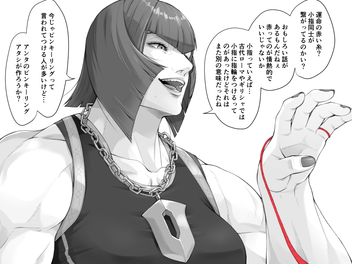 1girl broad_shoulders chain chain_necklace collarbone commentary_request jewelry marisa_(street_fighter) monochrome muscular muscular_female necklace nyusankin0yume short_hair solo spot_color street_fighter street_fighter_6 string string_of_fate translation_request upper_body