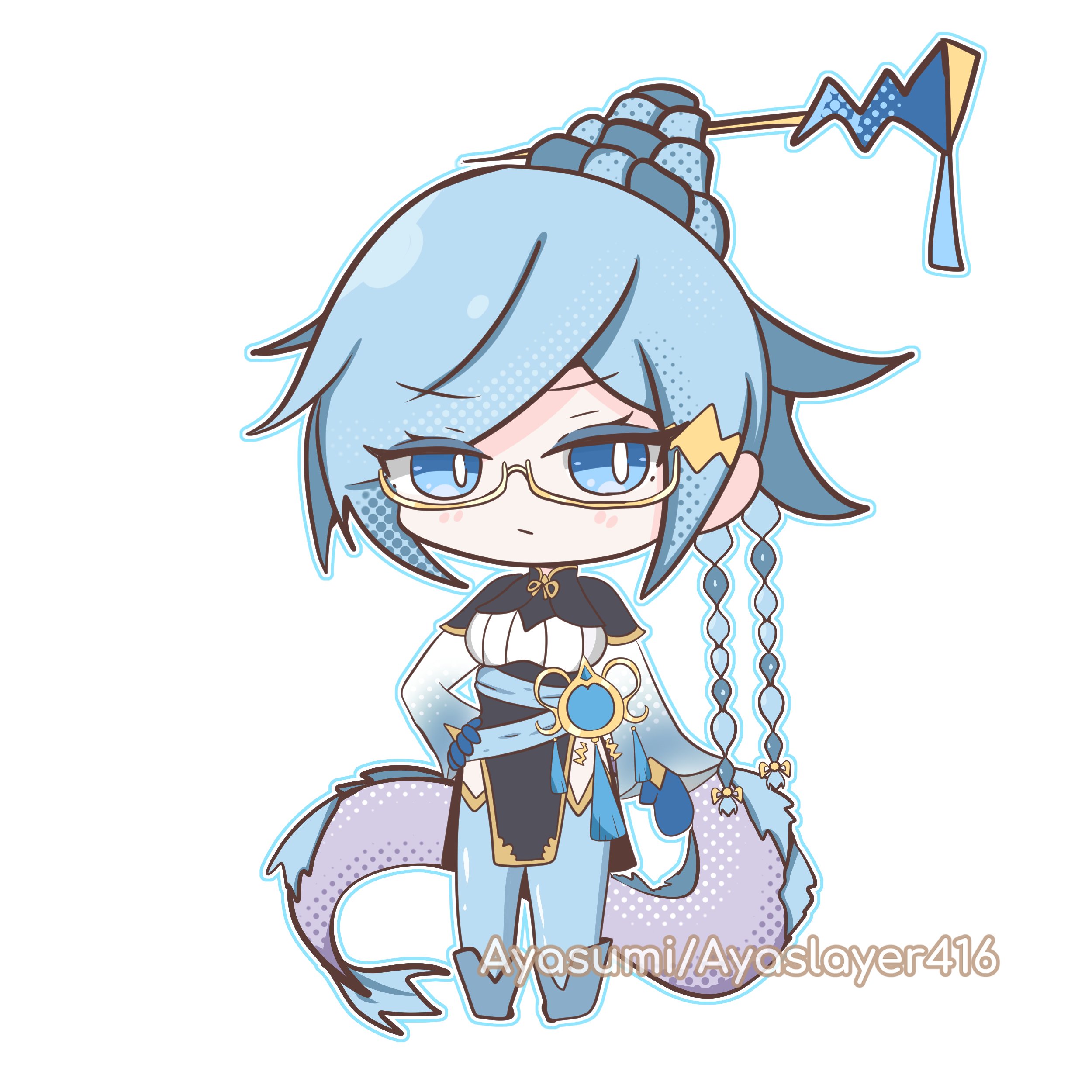 1girl absurdres aquarius_(symbol) ayasumi_(ayaslayer416) blue_hair blue_thighhighs braid braided_bun breasts chibi commentary_request dracotail_faimena dragon_girl dragon_tail duel_monster eastern_dragon_tail full_body glasses gloves hair_bun hair_ornament hair_stick hakama highres japanese_clothes jewelry large_breasts long_hair long_sleeves solo tail thighhighs twitter_username white_background white_hakama yu-gi-oh!