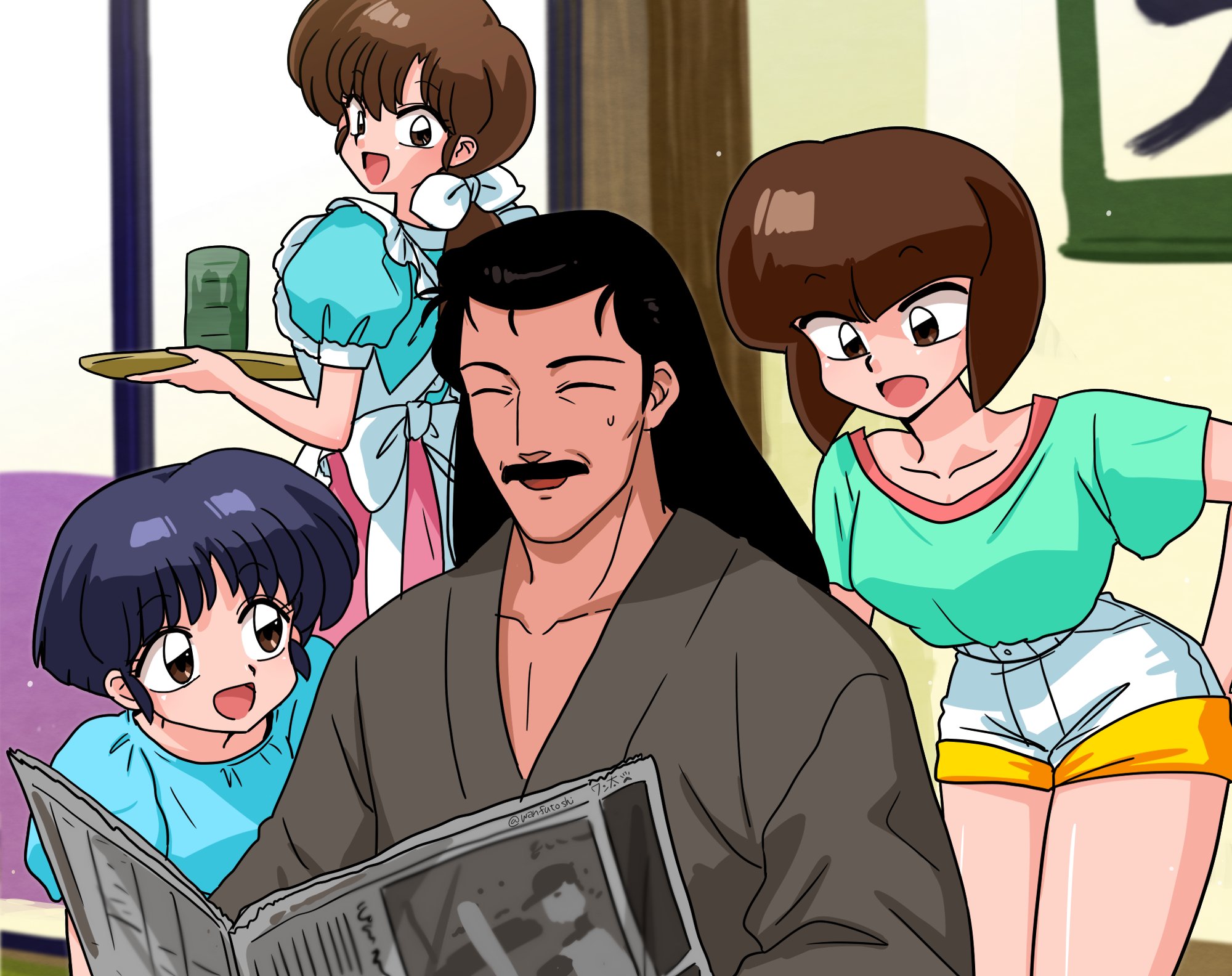 1boy 3girls :d ^_^ blue_hair breasts brown_eyes brown_hair cleavage closed_eyes collarbone commentary cup facial_hair father_and_child father_and_daughter green_shirt highres holding holding_newspaper long_hair low_ponytail mature_male multiple_girls mustache newspaper open_mouth parent_and_child ponytail ranma_1/2 shirt short_hair shorts siblings sisters smile tendou_akane tendou_kasumi tendou_nabiki tendou_souun wanta_(futoshi) white_shorts