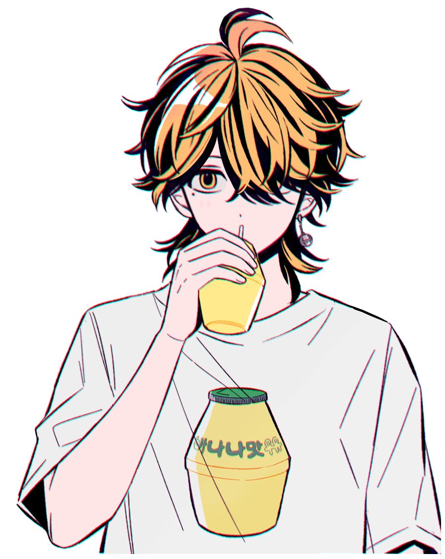 1boy antenna_hair black_hair blonde_hair earrings hair_over_one_eye hanemiya_kazutora jewelry looking_at_viewer male_focus medium_hair mole mole_under_eye multicolored_hair neck_tattoo ocolayapap shirt short_hair short_sleeves simple_background single_earring solo t-shirt tattoo tiger_tattoo tokyo_revengers two-tone_hair upper_body white_background white_shirt wolf_cut yellow_eyes yogurt