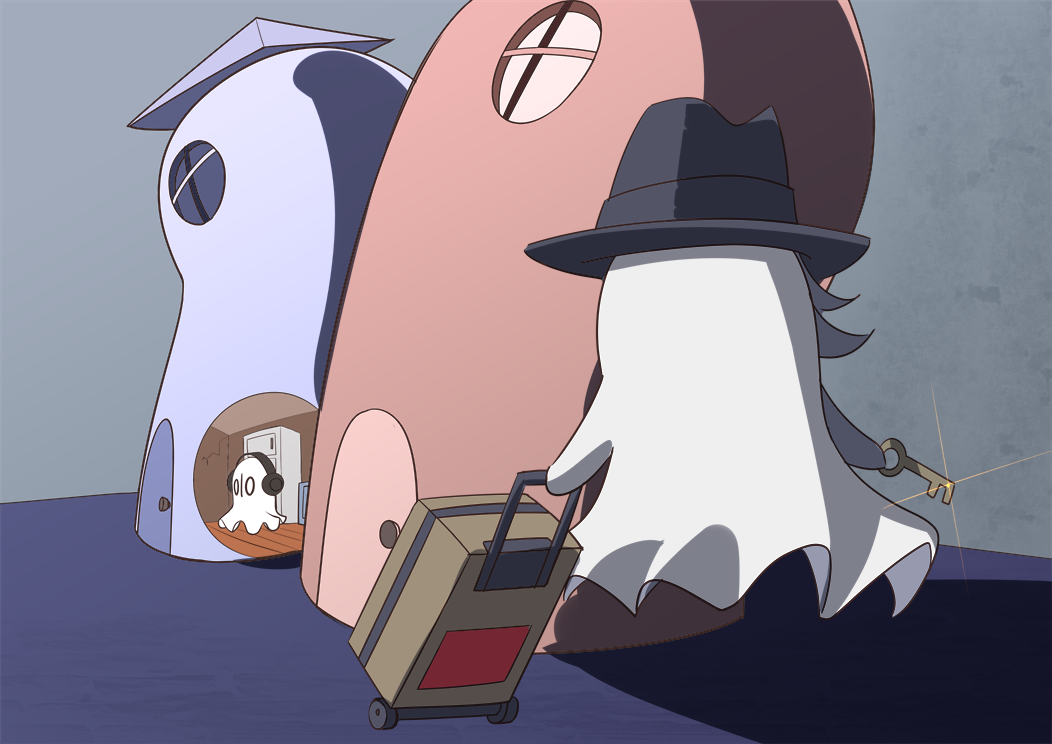 2boys black_hat brothers commentary_request crack cracked_wall door doorknob fedora from_behind ghost ghost_boy hat headphones holding holding_key holding_suitcase house houten_(dre_a_mer) in-universe_location key mettaton mettaton_(ghost) multiple_boys napstablook no_fingers no_humans refrigerator rolling_suitcase sheet_ghost siblings suitcase swept_bangs undertale utdr_(toby_fox) window wooden_floor x-ray