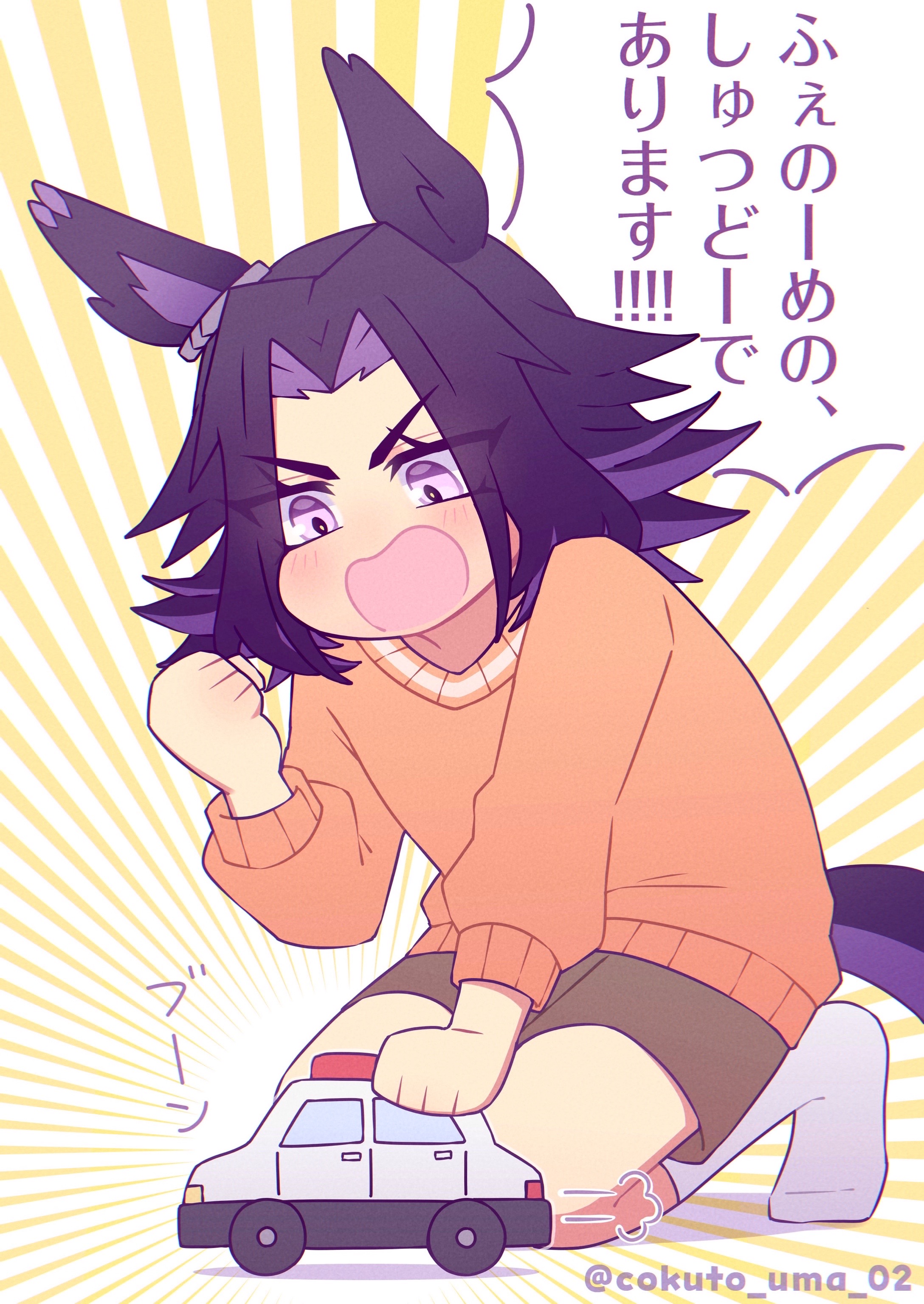 1girl absurdres aged_down animal_ears black_hair blush brown_shorts commentary_request fenomeno_(umamusume) flipped_hair highres horse_ears horse_girl horse_tail kneeling long_hair long_sleeves multicolored_hair orange_sweater purple_eyes purple_hair shorts socks speech_bubble sweater tail toy_car translation_request umamusume w3n6e white_socks