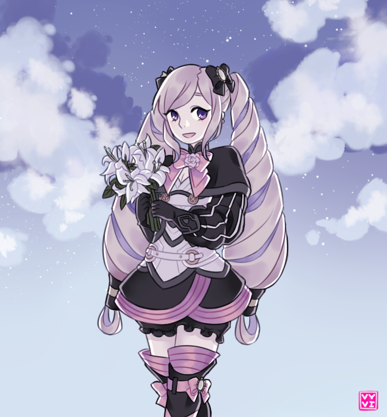 1girl :d black_bow blonde_hair bouquet bow breasts cleavage commentary drill_hair elise_(fire_emblem) english_commentary fire_emblem fire_emblem_fates flower hair_bow highres holding holding_bouquet long_hair looking_at_viewer multicolored_hair nintendo open_mouth purple_eyes purple_hair small_breasts smile solo streaked_hair thighs twin_drills twintails vyvii-blog1