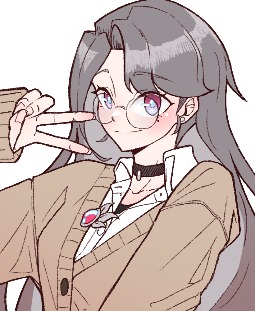 1girl black_choker choker collared_shirt commentary glasses grey_hair jiho_(un3337) korean_commentary long_hair long_sleeves looking_at_viewer mole mole_under_eye original shirt simple_background smile v white_shirt