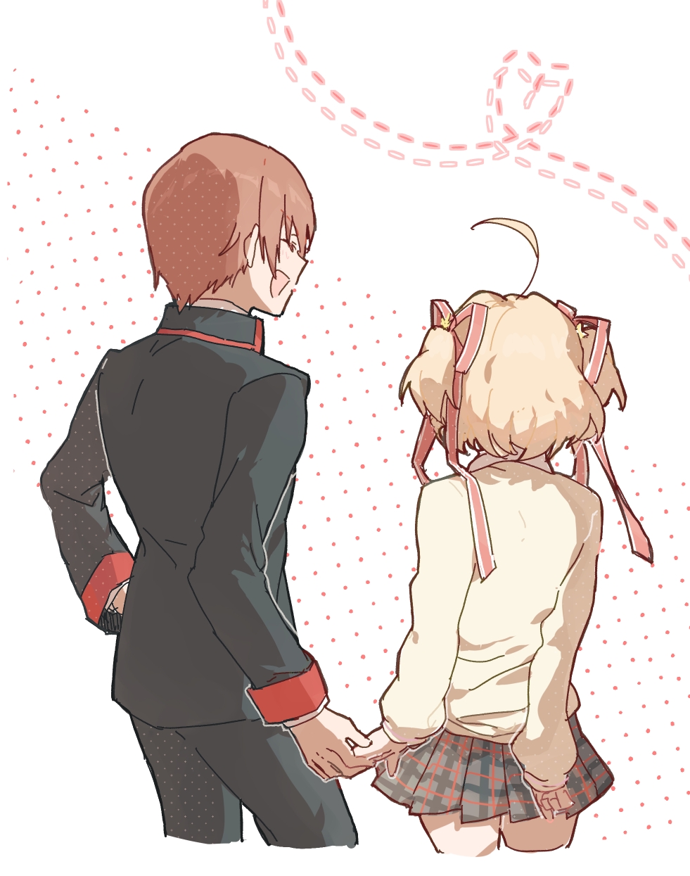 1boy 1girl :d ^_^ ahoge arms_behind_back black_jacket black_pants blonde_hair brown_hair closed_eyes commentary couple cowboy_shot cropped_legs from_behind grey_skirt hair_ornament hair_ribbon happy heart heart_of_string hetero highres holding_hands jacket kamikita_komari little_busters! little_busters!_school_uniform long_ribbon long_sleeves medium_hair miniskirt mydandeliongirl natsume_kyousuke open_mouth pants pink_ribbon plaid_clothes plaid_skirt pleated_skirt profile ribbon school_uniform short_hair simple_background skirt sleeves_past_wrists smile star_(symbol) star_hair_ornament sweater untranslatable_commentary white_background yellow_sweater