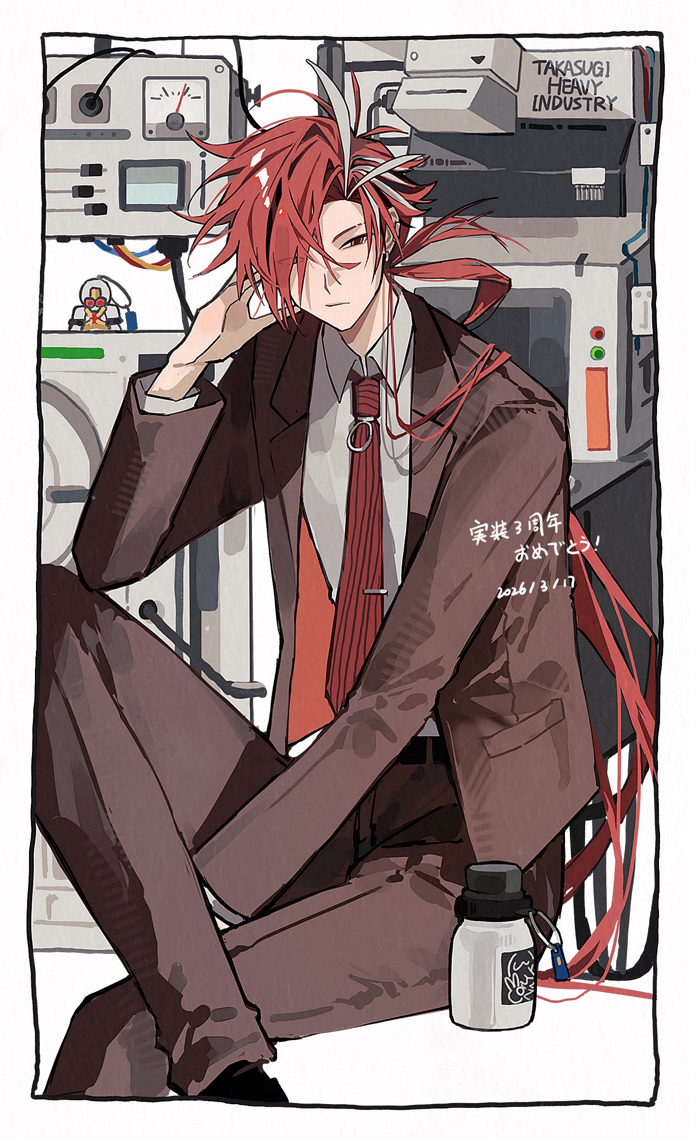 1boy black_hair bottle brown_jacket brown_pants brown_suit collared_shirt dianci_sanweixian eyebrow_cut fate/grand_order fate_(series) formal_clothes hair_over_shoulder highres jacket long_hair long_sleeves low_ponytail machine multicolored_hair necktie open_clothes open_jacket pants ponytail red_eyes red_hair red_necktie shirt sitting solo streaked_hair striped_clothes suit takasugi_shinsaku_(fate) vertical-striped_clothes vertical-striped_necktie very_long_hair water_bottle white_hair white_shirt