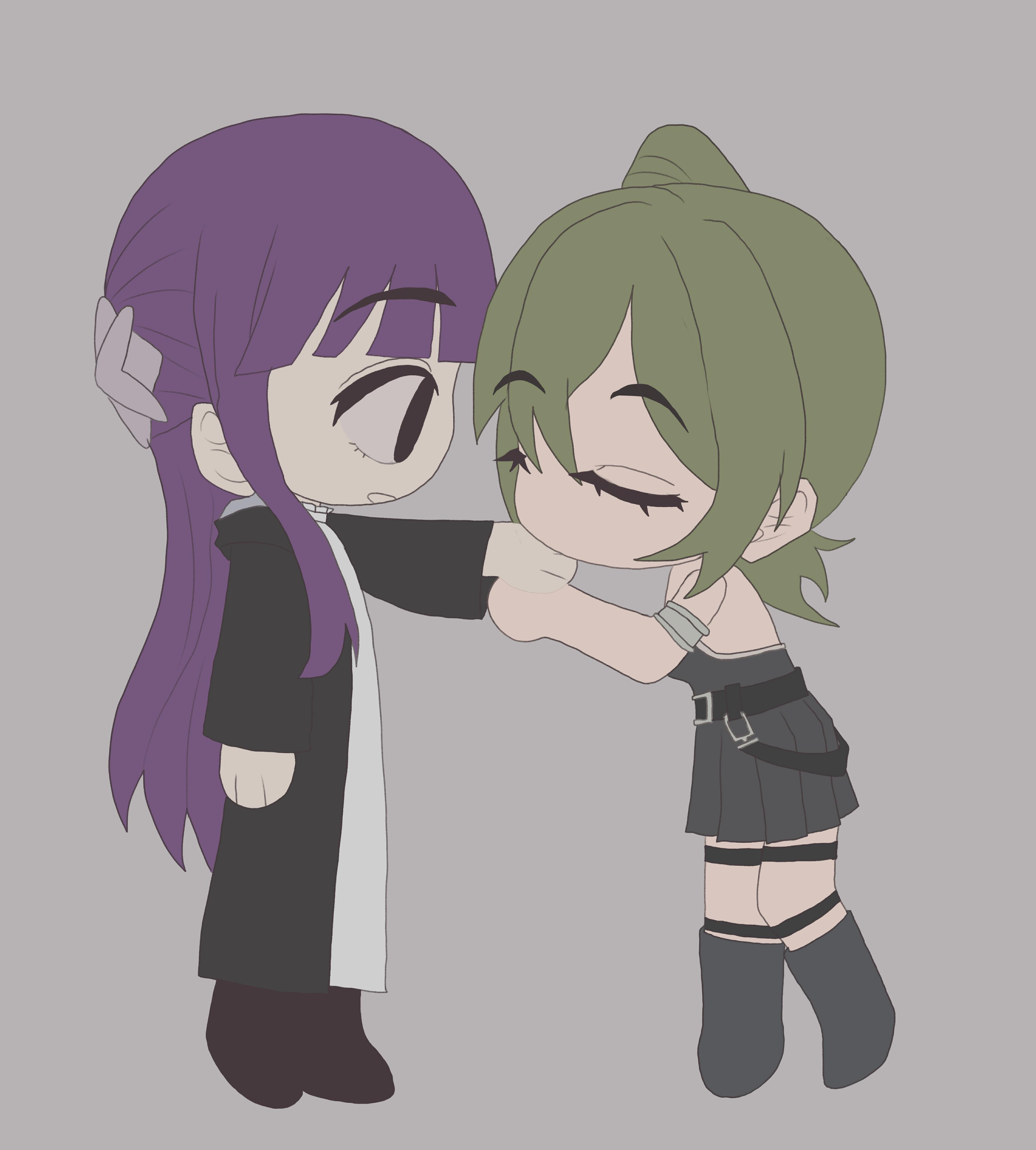 2girls absurdres armlet belt black_belt black_boots black_coat black_dress black_eyes blunt_bangs boots breasts chibi chibi_only coat commentary dress english_commentary fern_(sousou_no_frieren) green_hair grey_background hair_ornament highres hime_cut holding_hands jewelry kiss kissing_hand long_hair looking_at_another medium_breasts multiple_girls outrageous-froyo-417 pleated_dress purple_hair side_ponytail sousou_no_frieren standing ubel_(sousou_no_frieren) white_dress yuri