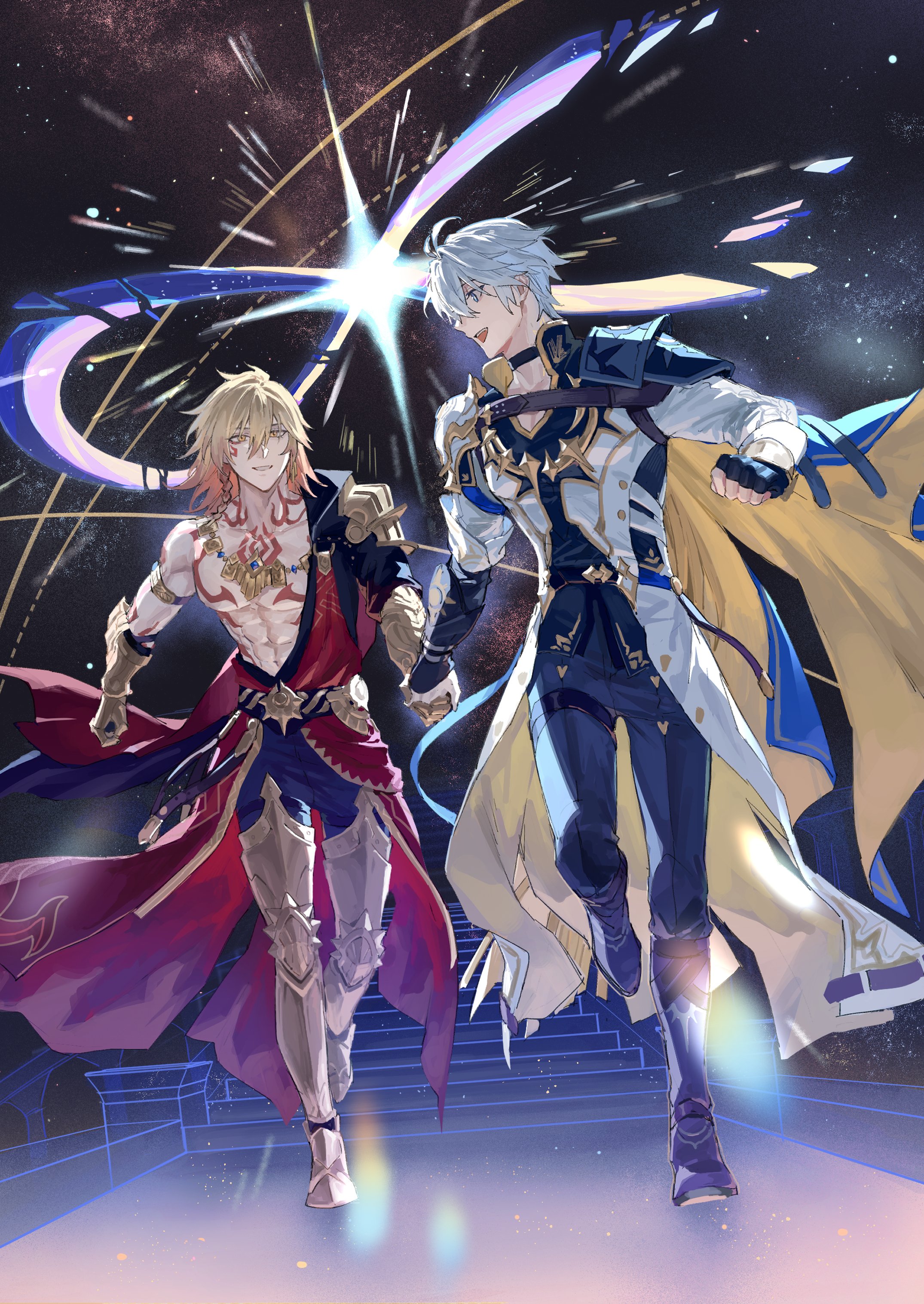 2boys abs absurdres akabane_yu amphoreus_(honkai:_star_rail) antenna_hair arm_tattoo armlet armor armored_boots black_choker black_coat black_pants black_shirt blonde_hair blue_cape blue_eyes boots braid cape chest_tattoo choker clawed_gauntlets coat earrings facial_tattoo gold_earrings gold_necklace gradient_hair highres holding_hands honkai:_star_rail honkai_(series) infinity_symbol jewelry knee_boots male_focus medium_hair multicolored_hair multiple_boys mydei_(honkai:_star_rail) neck_tattoo necklace open_clothes open_coat pants parted_bangs pauldrons phainon_(honkai:_star_rail) red_cape red_hair red_tattoo shirt short_hair shoulder_armor side_braid side_cape single_pauldron sky star_(sky) starry_sky sun_symbol sun_tattoo tan tattoo toned toned_male two-sided_cape two-sided_fabric white_coat white_hair yellow_cape yellow_eyes