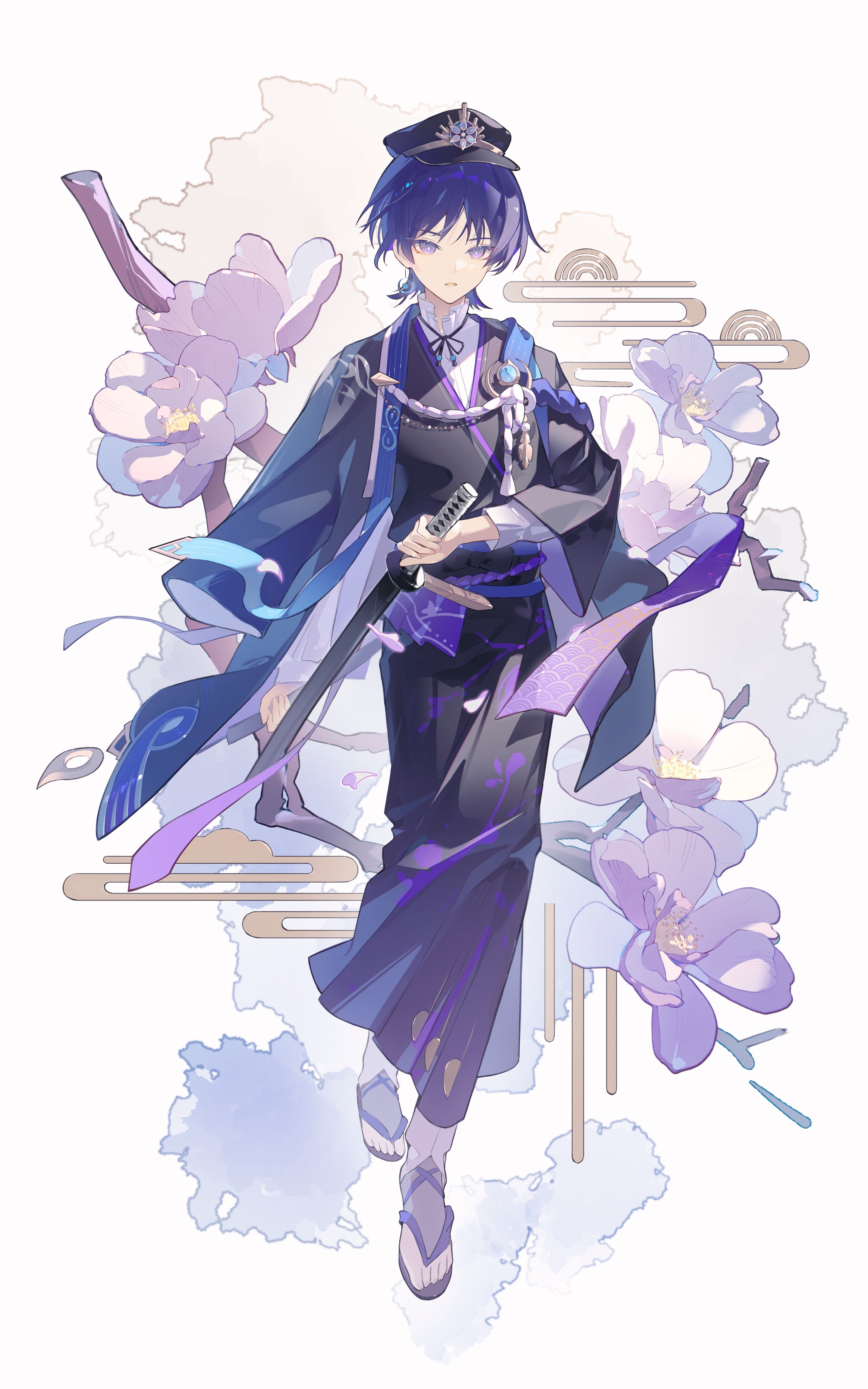 1boy absurdres alternate_costume branch chinese_commentary commentary_request flower full_body genshin_impact hair_between_eyes hat head_tilt highres holding holding_sword holding_weapon japanese_clothes katana kimono long_sleeves looking_at_viewer open_mouth purple_eyes purple_hair sandals scaramouche_(genshin_impact) solo sword toes vision_(genshin_impact) wanderer_(genshin_impact) weapon wide_sleeves yecangshu