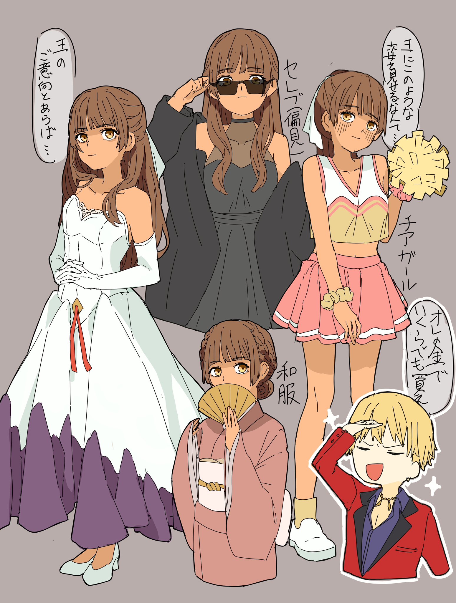 1boy 1girl alternate_costume blonde_hair bow braid braided_bun brown_hair cheerleader dark-skinned_female dark_skin dress elbow_gloves fate/strange_fake fate_(series) formal_clothes gilgamesh_(fate) gloves hair_bun hand_fan high_heels jacket japanese_clothes kimono long_hair red_suit sleeveless sleeveless_dress suit sunglasses tine_chelc v-neck white_dress yellow_eyes