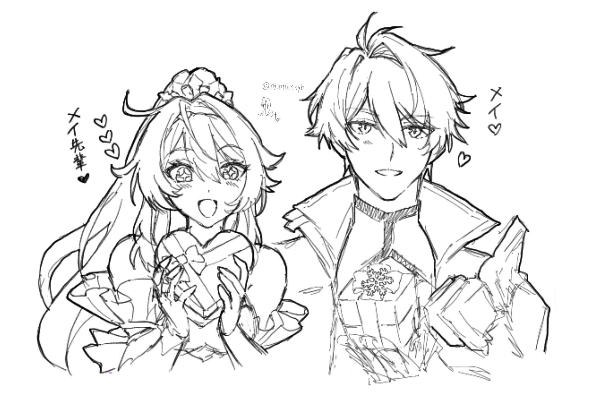 +_+ 1boy 1girl ahoge armor artist_name bare_shoulders blush bow box box_of_chocolates breasts clothing_cutout commentary_request detached_sleeves dress gift gift_box gloves hair_between_eyes hands_up happy heart heart-shaped_box high_ponytail highres holding holding_box holding_gift honkai_(series) honkai_impact_3rd jacket kevin_kaslana kiana_kaslana kiana_kaslana_(herrscher_of_finality) lapels long_hair looking_at_object looking_at_viewer medium_breasts mmmmhyb monochrome open_clothes open_jacket open_mouth ponytail shirt short_hair short_sleeves shoulder_armor sidelocks signature simple_background sleeveless sleeveless_dress smile teeth tiara upper_body wavy_hair