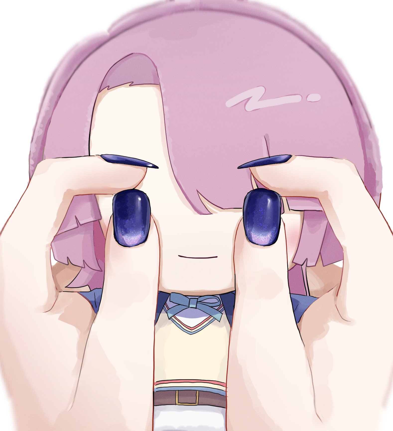 1other arimura_mao asymmetrical_bangs blue_bow blue_bowtie blue_jacket bow bowtie character_doll commentary_request doll expressive_fingernails_cinnamoroll_plush gakuen_idolmaster hair_over_one_eye highres idolmaster jacket long_sleeves okome_(cccooommmgggrrr) photo-referenced pink_hair pov pov_hands purple_eyes purple_nails school_uniform short_hair simple_background white_background