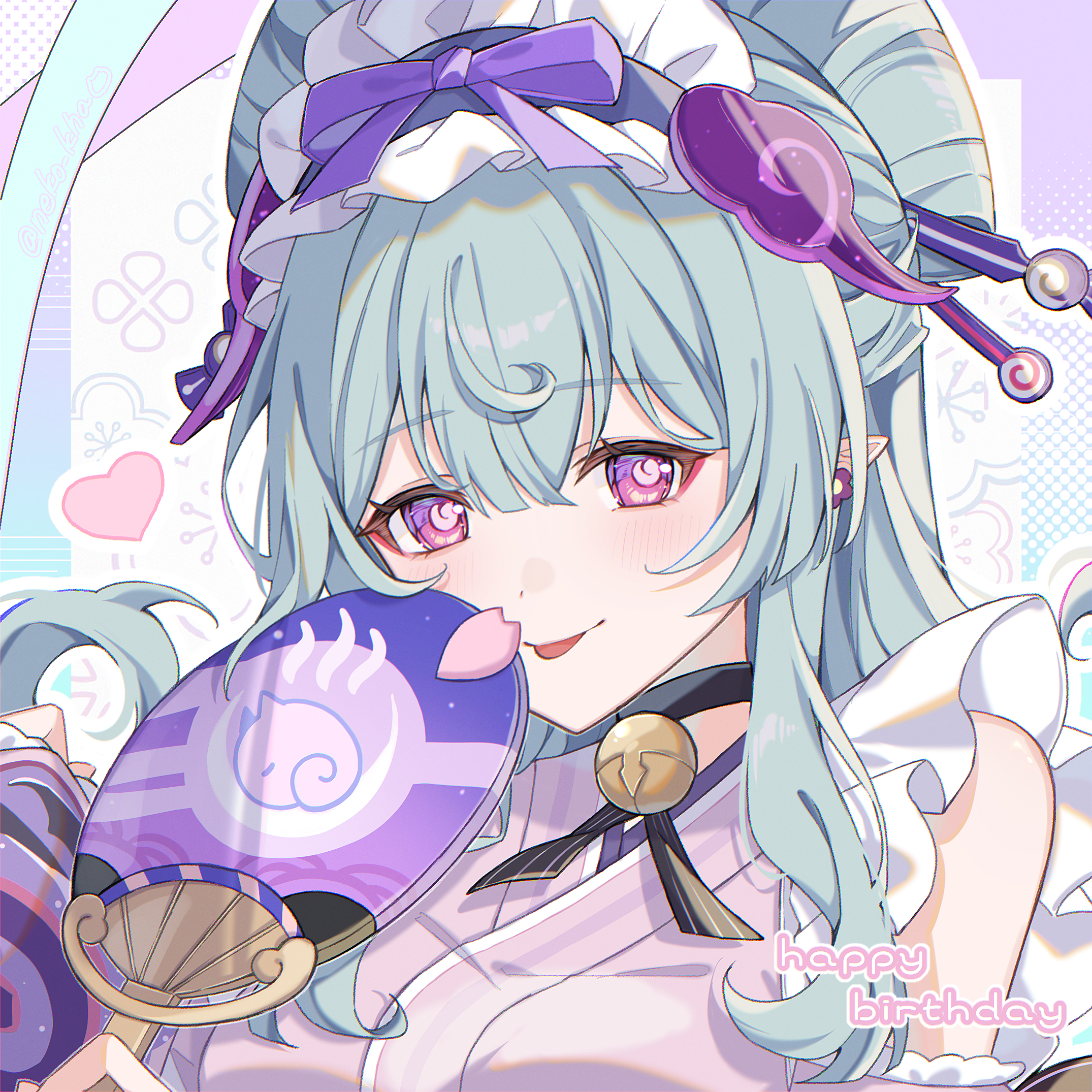 1girl :p bell black_choker blue_hair blush choker closed_mouth commentary_request earrings frilled_hairband frills genshin_impact hair_between_eyes hairband hand_fan happy_birthday highres holding holding_fan japanese_clothes jewelry kimono long_hair looking_at_viewer neck_bell nihongami nya_inuha pink_kimono pointy_ears purple_eyes smile solo tongue tongue_out yumemizuki_mizuki