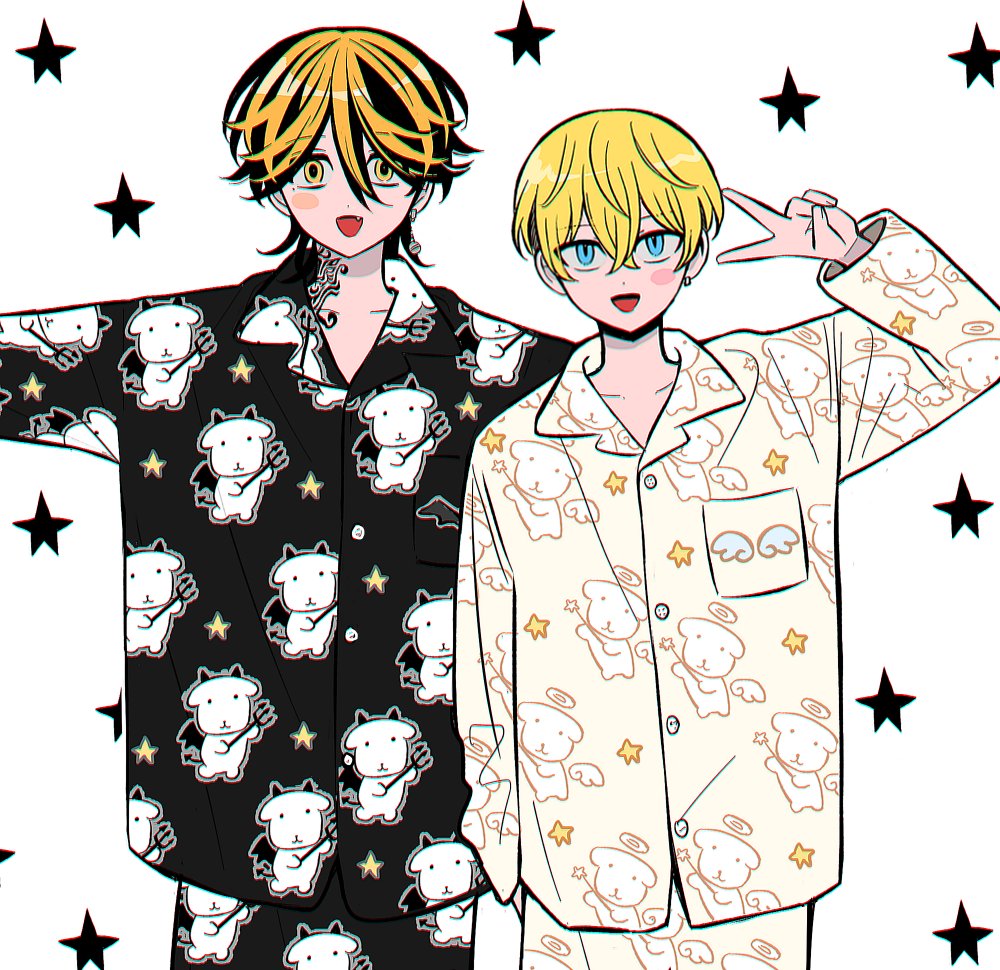 2boys alternate_costume animal_print black_hair black_pajamas blonde_hair blue_eyes commentary_request dog_print dyu...ganadi earrings fang hair_between_eyes hanemiya_kazutora jewelry korean_commentary long_sleeves male_focus matsuno_chifuyu mole mole_under_eye multicolored_hair multiple_boys neck_tattoo ocolayapap open_mouth pajamas pants print_pajamas print_pants short_hair simple_background single_earring smile star_(symbol) star_print streaked_hair tattoo tiger_tattoo tokyo_revengers two-tone_hair upper_body v white_background white_pajamas yellow_eyes