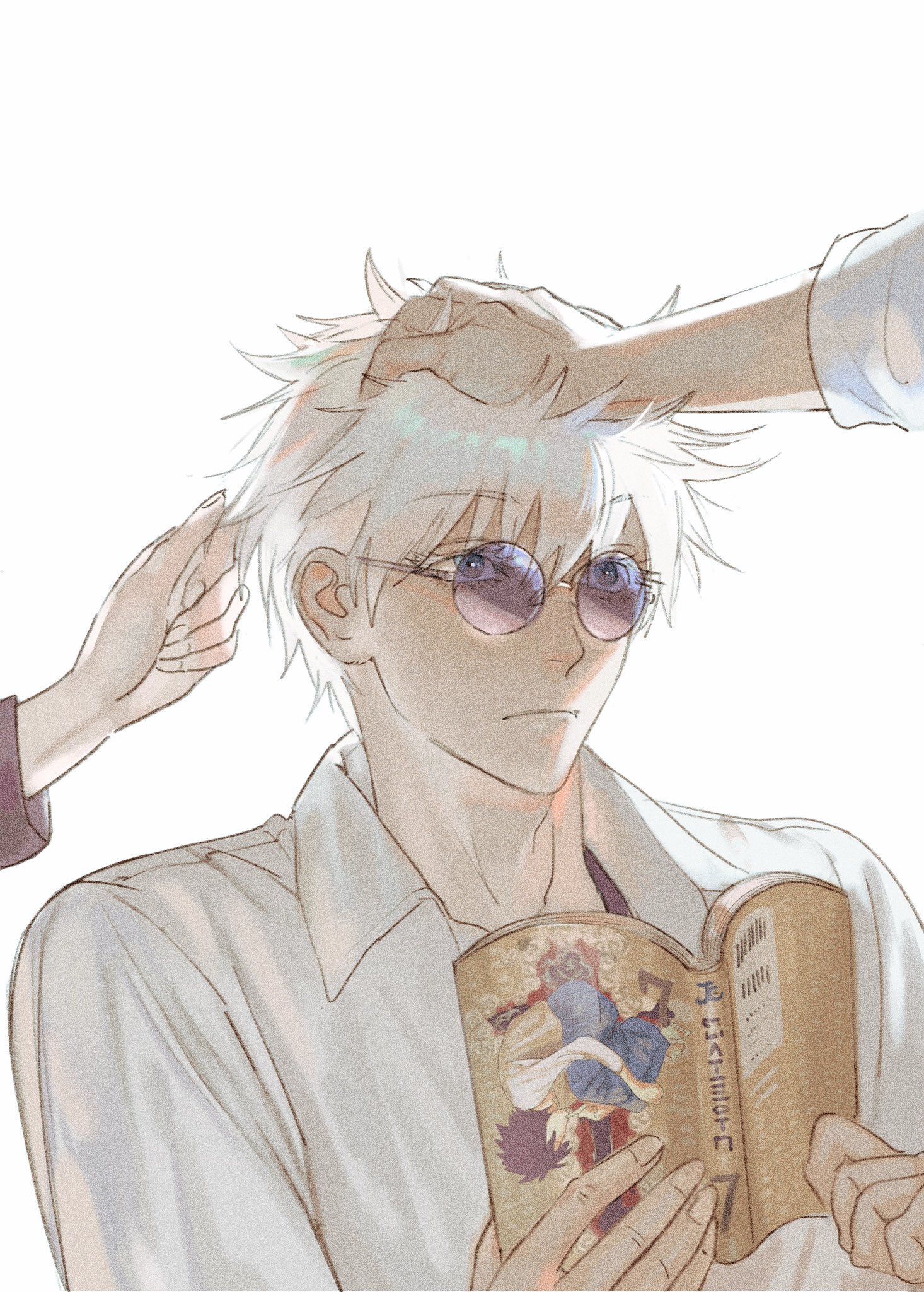 1girl 2boys closed_mouth collared_shirt commentary_request geto_suguru glasses gojo_satoru hand_in_another's_hair headpat highres holding holding_manga ieiri_shoko jujutsu_kaisen male_focus manga_(object) multiple_boys naspibon_ox round_eyewear shirt short_hair simple_background solo_focus upper_body white_background white_hair white_shirt