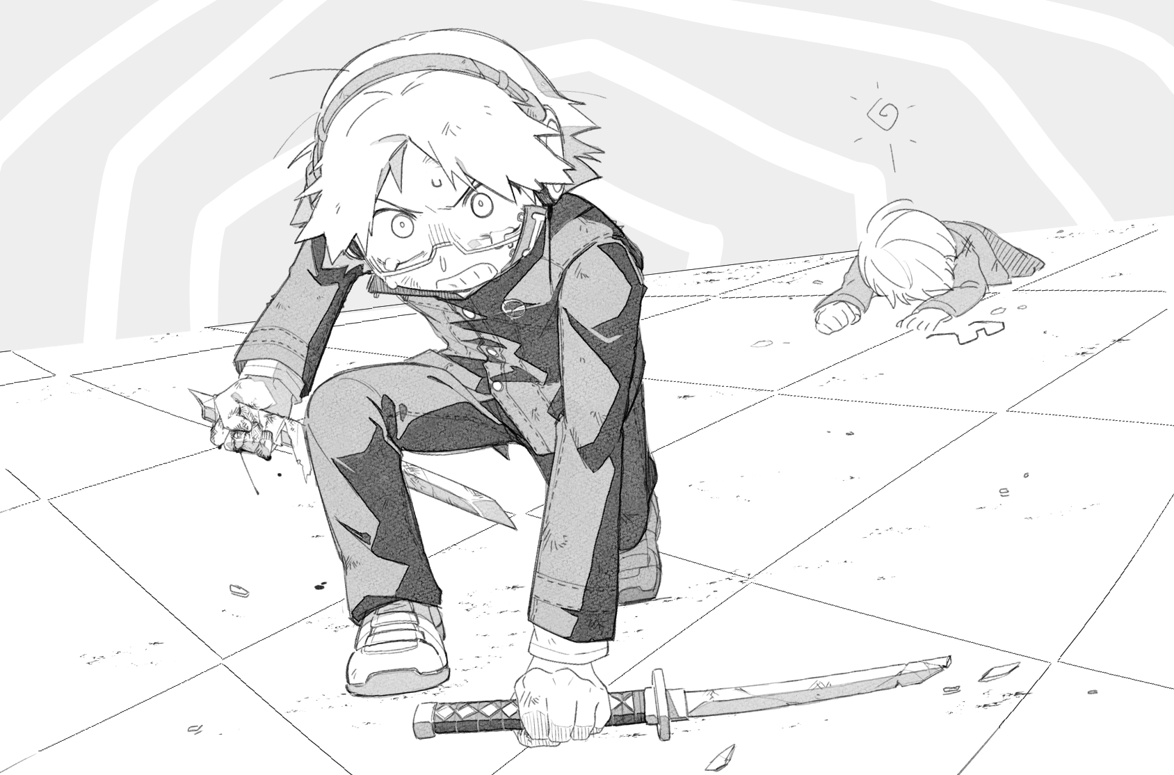 2boys angry blood blood_on_hands broken broken_sword broken_weapon clenched_teeth full_body glasses greyscale hanamura_yousuke headphones highres holding holding_sword holding_weapon jacket kkyagdoyo164972 long_sleeves looking_at_viewer lying male_focus monochrome multiple_boys narukami_yu on_ground on_stomach pants persona persona_4 revenge school_uniform shoes short_hair sword tears teeth unworn_eyewear weapon yasogami_school_uniform