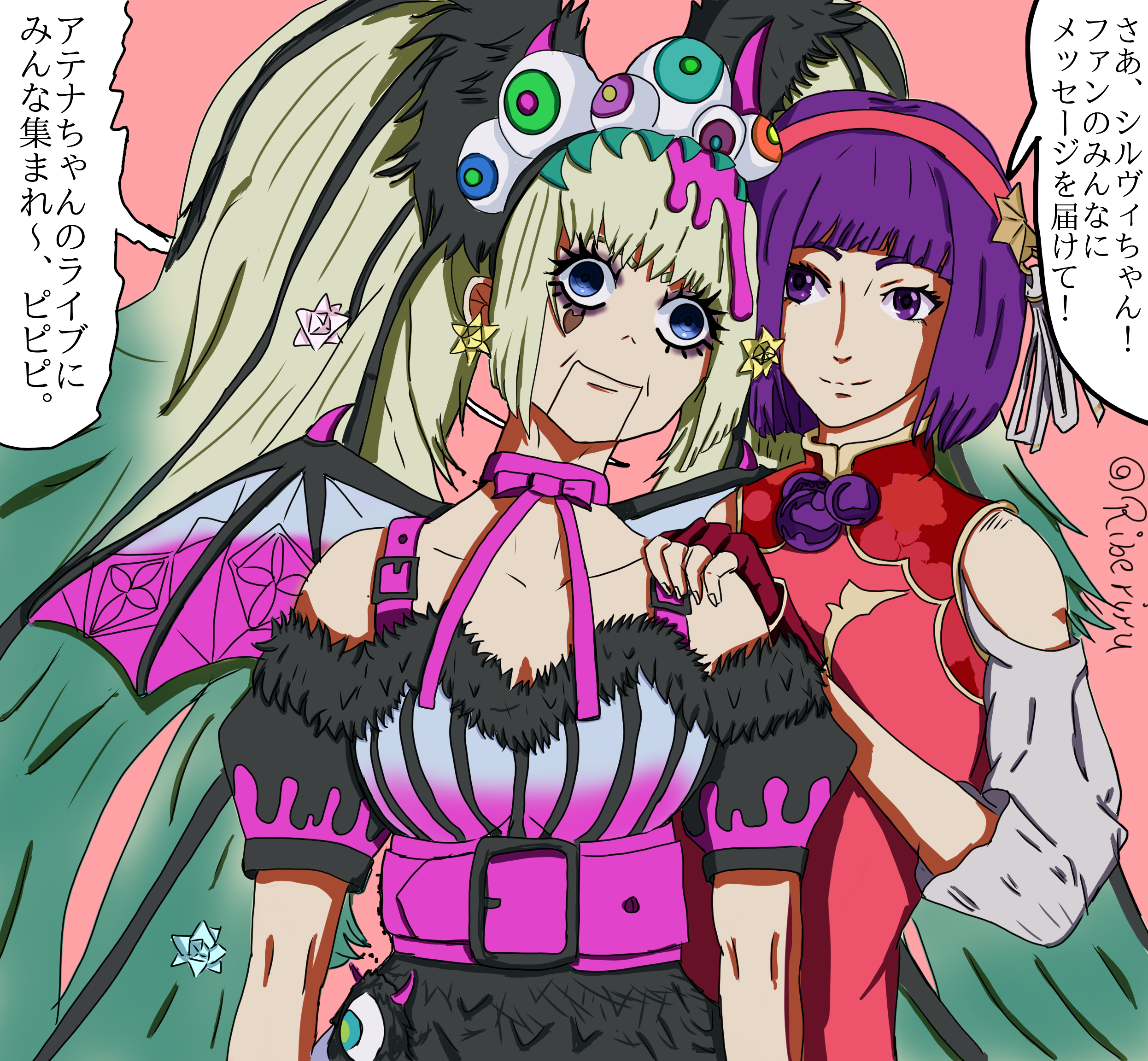 2girls asamiya_athena blonde_hair blue_eyes highres idol mind_control multiple_girls parody psycho_soldier puppet purple_eyes purple_hair riberiru snk sylvie_paula_paula the_king_of_fighters the_king_of_fighters_xv ventriloquism