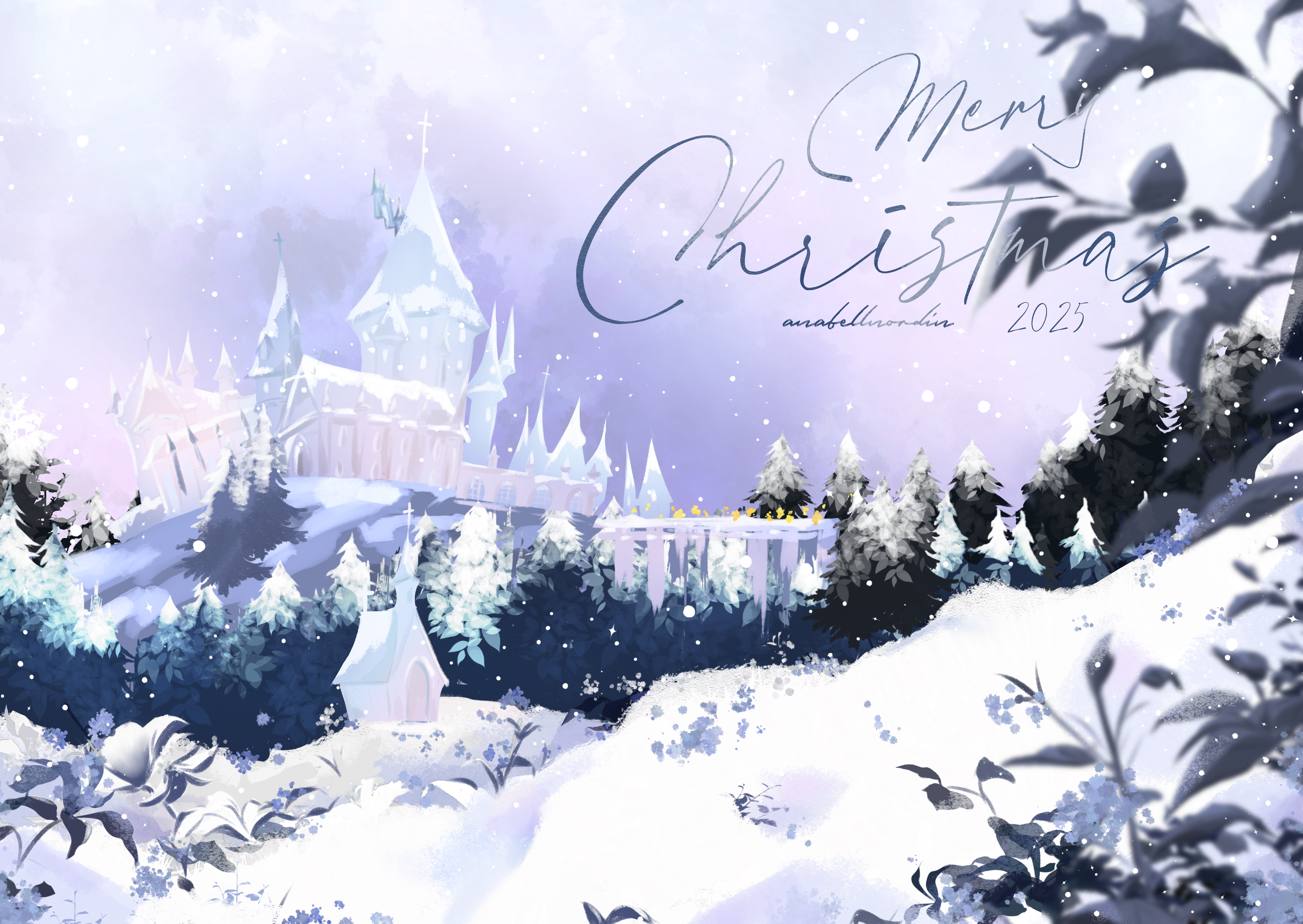 2025 absurdres anabellnordin artist_name bridge castle church day english_text highres hill merry_christmas original outdoors scenery sky snow snowing tree