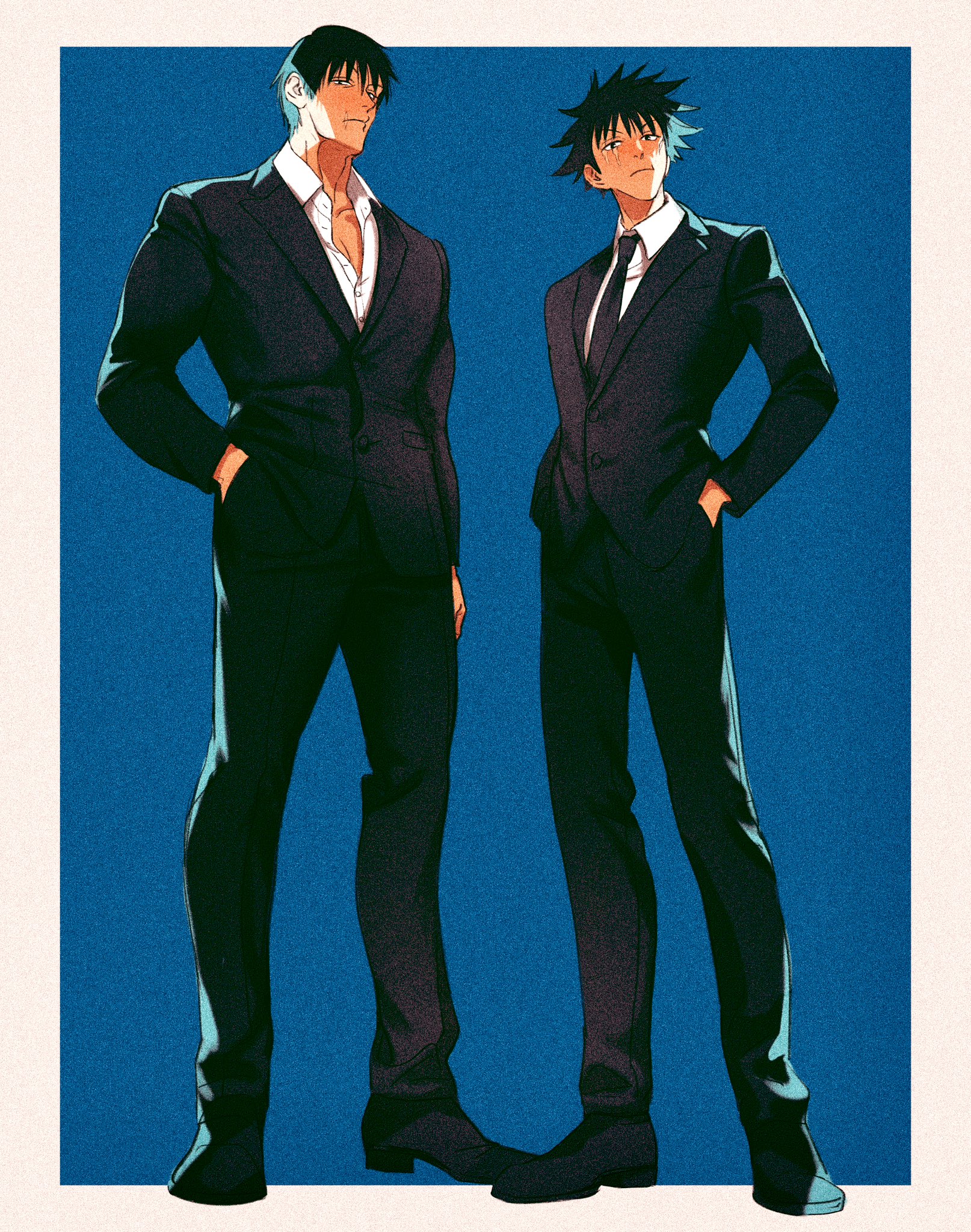 2boys alternate_scar black_hair black_jacket black_necktie black_pants black_suit blue_background border closed_mouth collared_shirt suit_pants dress_shirt dress_shoes father_and_child father_and_son formal_clothes full_body fushiguro_megumi fushiguro_toji hand_in_pocket height_difference highres jacket jujutsu_kaisen male_focus multiple_boys naspibon_ox necktie open_collar outside_border pants parent_and_child partially_unbuttoned scar scar_across_eye scar_on_face scar_on_mouth shirt short_hair standing suit suit_jacket white_border white_shirt
