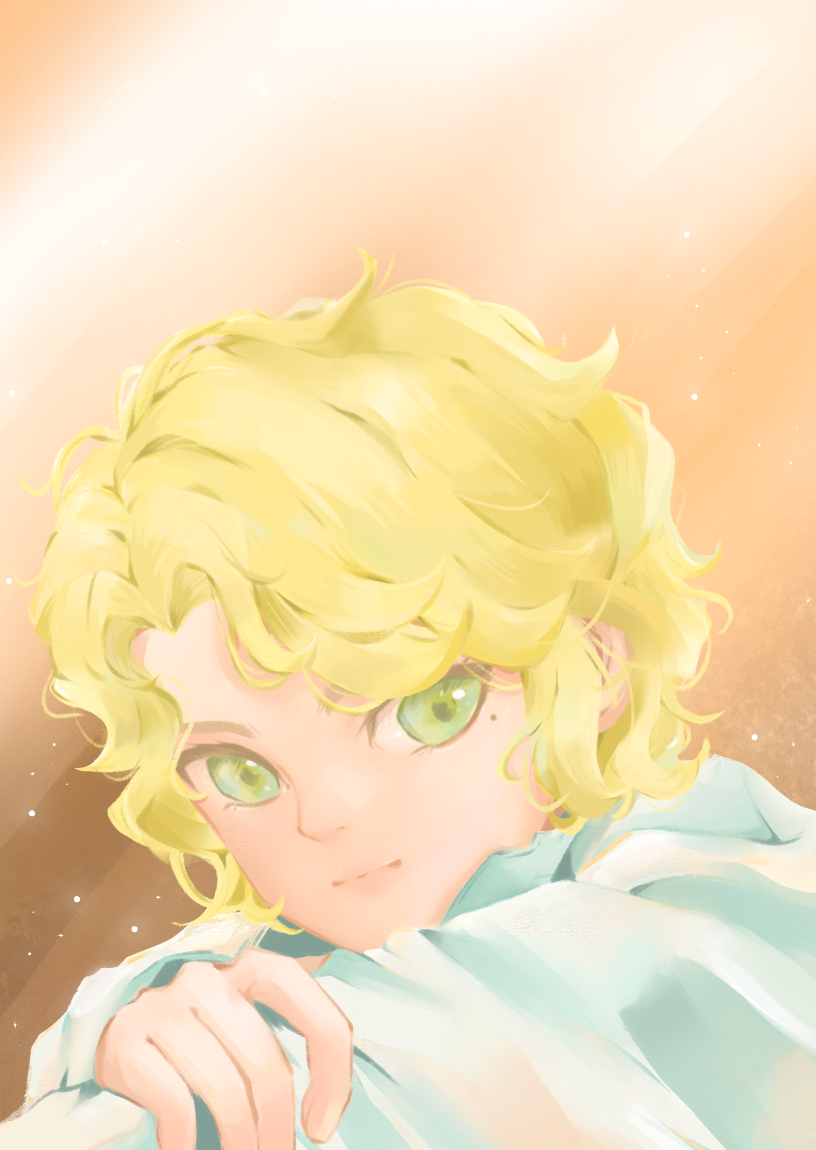 anabellnordin blonde_hair closed_mouth from_side gender_request green_eyes hand_on_own_arm highres looking_at_viewer looking_to_the_side mole mole_under_eye original short_hair solo