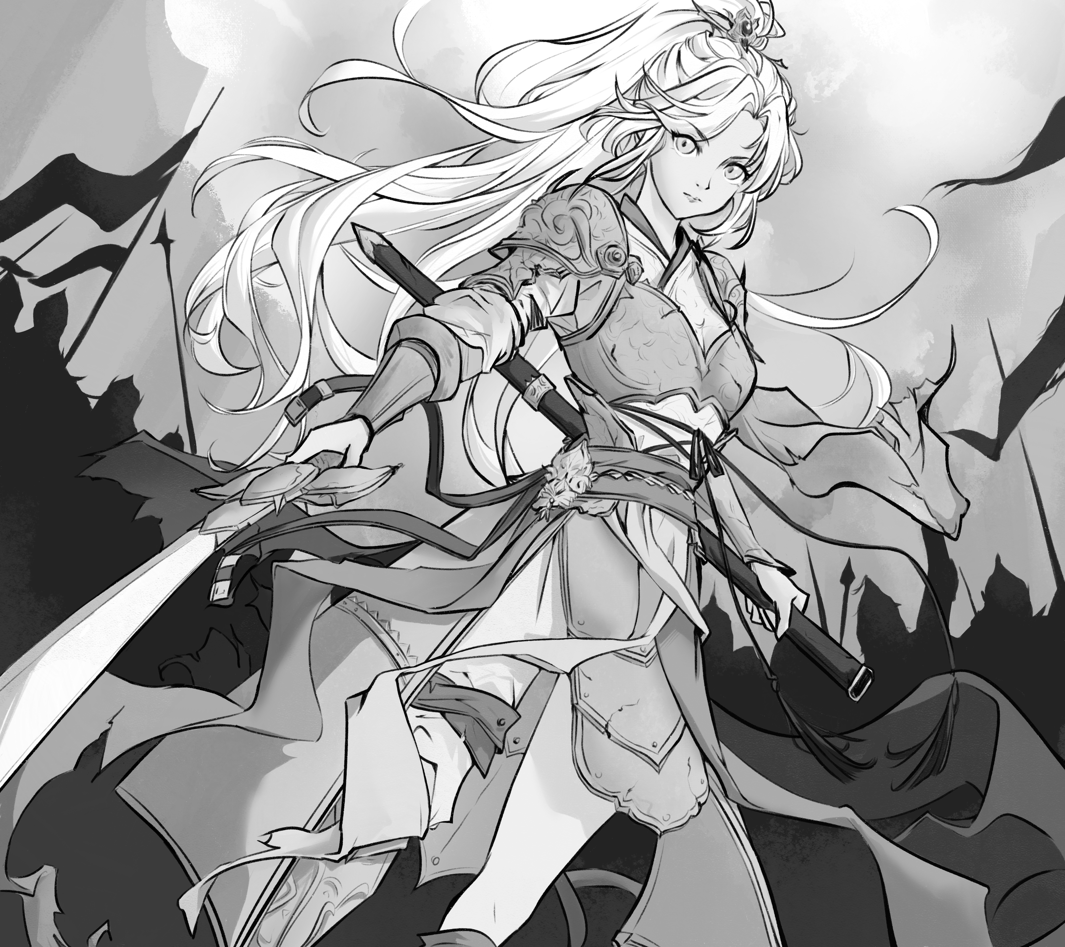 1girl absurdres anabellnordin armor boobplate breastplate closed_mouth crowd from_below hair_ornament high_ponytail highres holding holding_sheath holding_sword holding_weapon japanese_armor lips long_hair looking_at_viewer monochrome original pauldrons ponytail sheath shoulder_armor sky smoke solo_focus standing sword tassel weapon