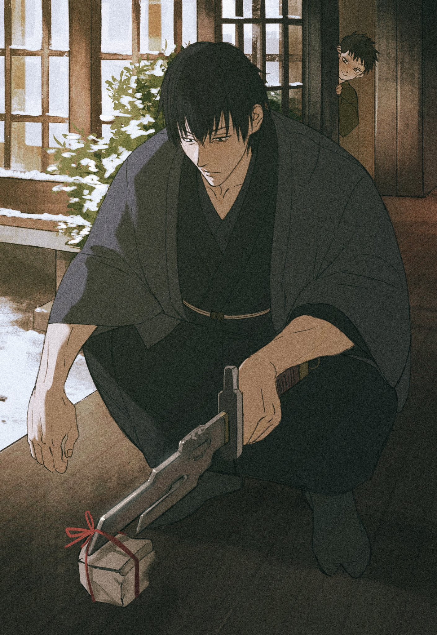 2boys aged_down black_hair blush box bush closed_mouth clothing_request commentary_request full_body fushiguro_toji gift gift_box highres indoors inverted_spear_of_heaven_(jujutsu_kaisen) japanese_clothes jujutsu_kaisen male_focus multiple_boys naspibon_ox peeking snow squatting zen'in_naoya