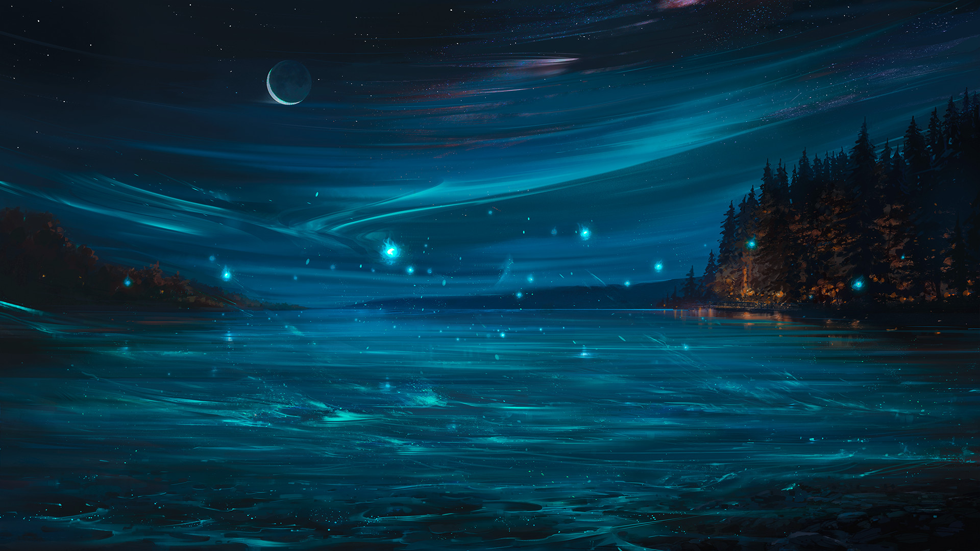 aenamiart commentary english_commentary forest full_moon highres lake landscape light_particles moon nature night original outdoors painterly pine_tree rain scenery sky star_(sky) starry_sky tree water will-o'-the-wisp_(mythology)