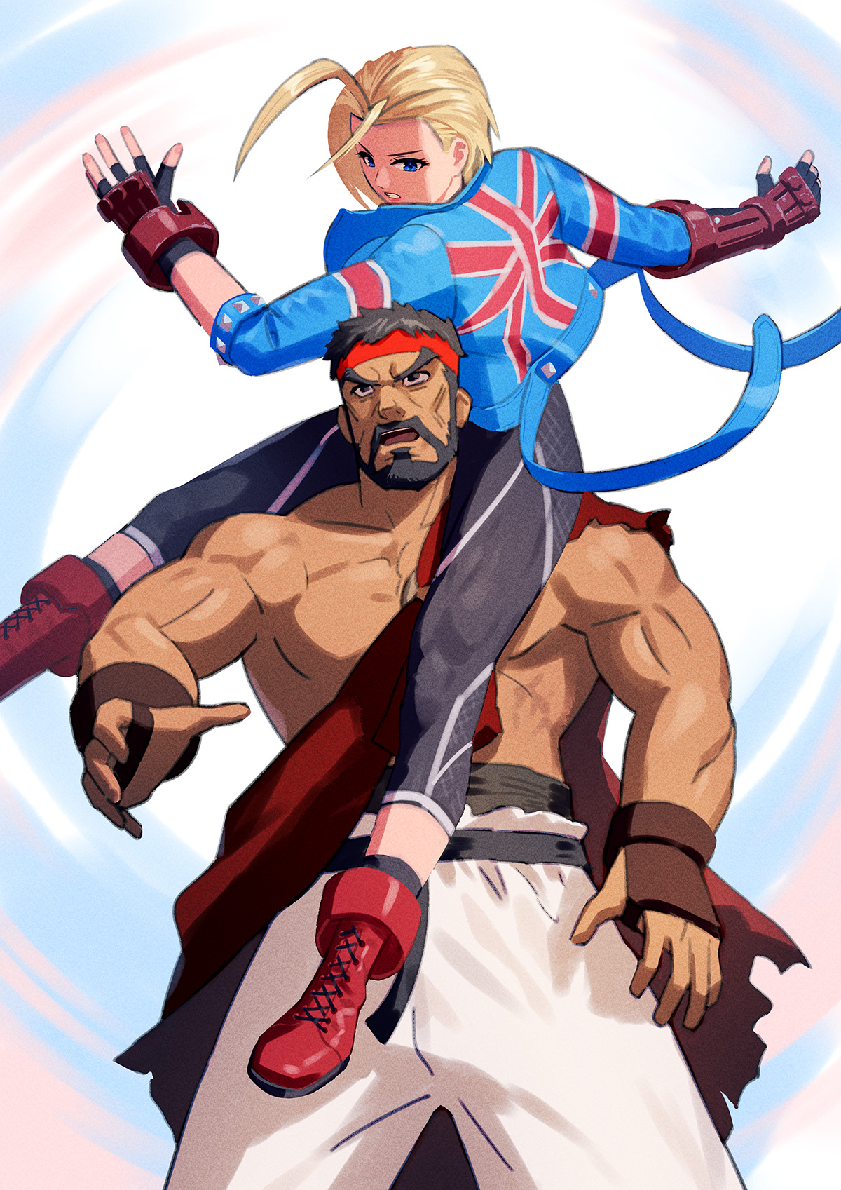 1boy 1girl blonde_hair blue_eyes cammy_white commentary fingerless_gloves gloves headband highres muscular muscular_male red_headband ryu_(street_fighter) short_hair street_fighter street_fighter_6 union_jack_print yagi2013