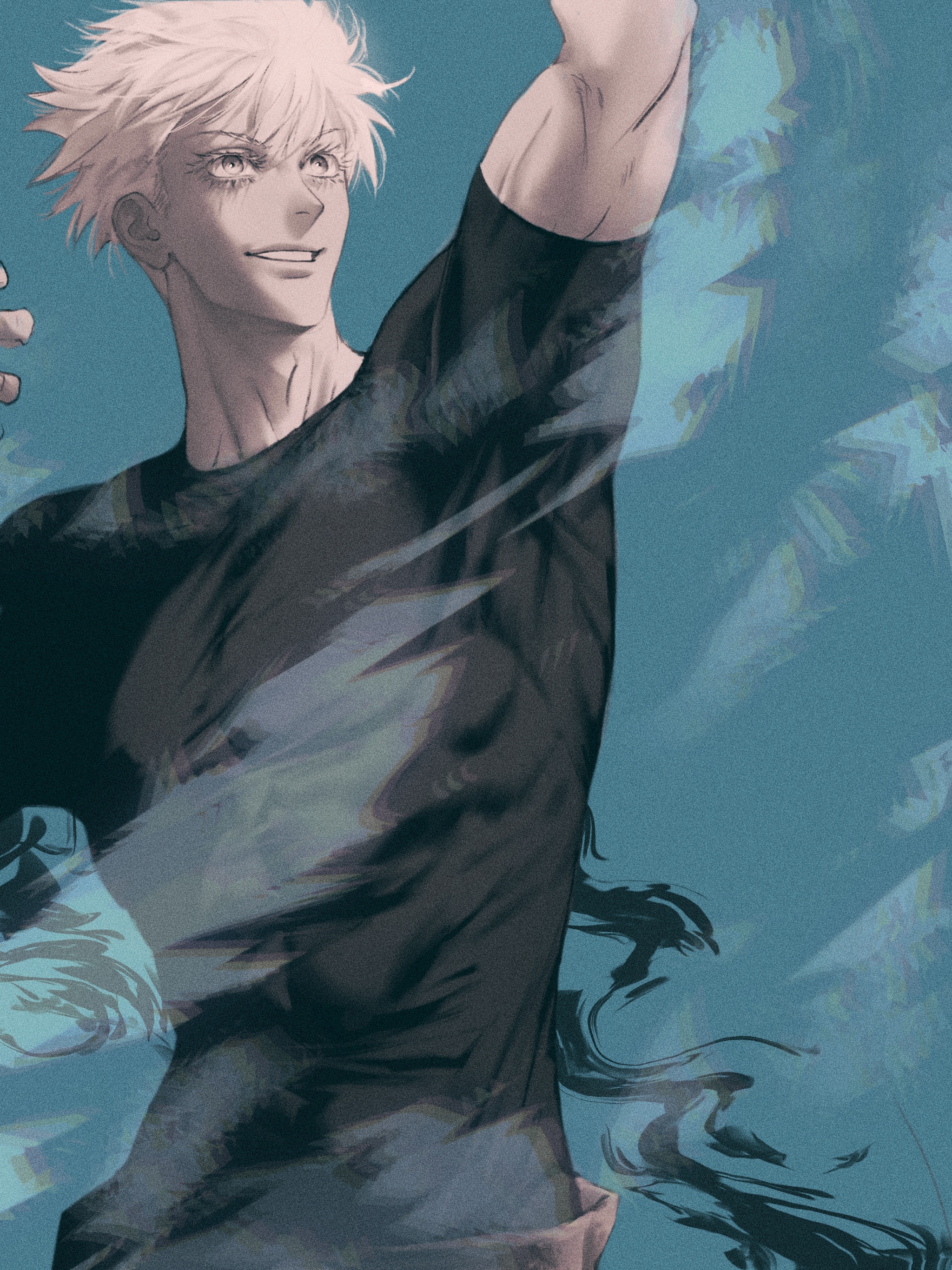 1boy absurdres adam's_apple arms_up biceps blue_background closed_mouth colored_eyelashes commentary_request compression_shirt eyelashes gojo_satoru greyscale_with_colored_background highres jujutsu_kaisen male_focus muscular muscular_male naspibon_ox shirt short_hair simple_background smile solo teeth