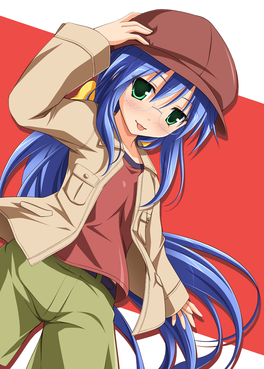 00s 1girl bad_id bad_pixiv_id beret bespectacled blue_eyes newsboy_cap female_focus glasses green_eyes hat highres izumi_konata jacket long_hair lucky_star mole mole_under_eye solo tongue tsuda_akira