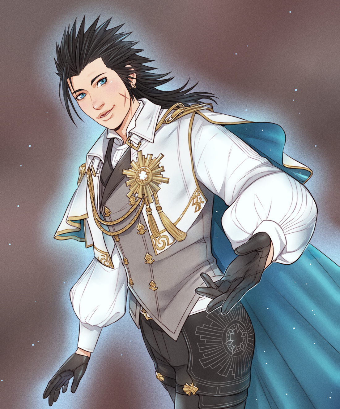 1boy black_gloves black_hair blue_cape blue_eyes cape commentary cross_scar crylin6 earrings english_commentary facial_scar final_fantasy final_fantasy_vii final_fantasy_vii:_ever_crisis gloves grey_vest highres jewelry long_sleeves looking_at_viewer male_focus official_alternate_costume open_hand parted_lips scar scar_on_cheek scar_on_face shirt short_hair solo spiked_hair vest white_shirt zack_fair zack_fair_(festive_jacket)