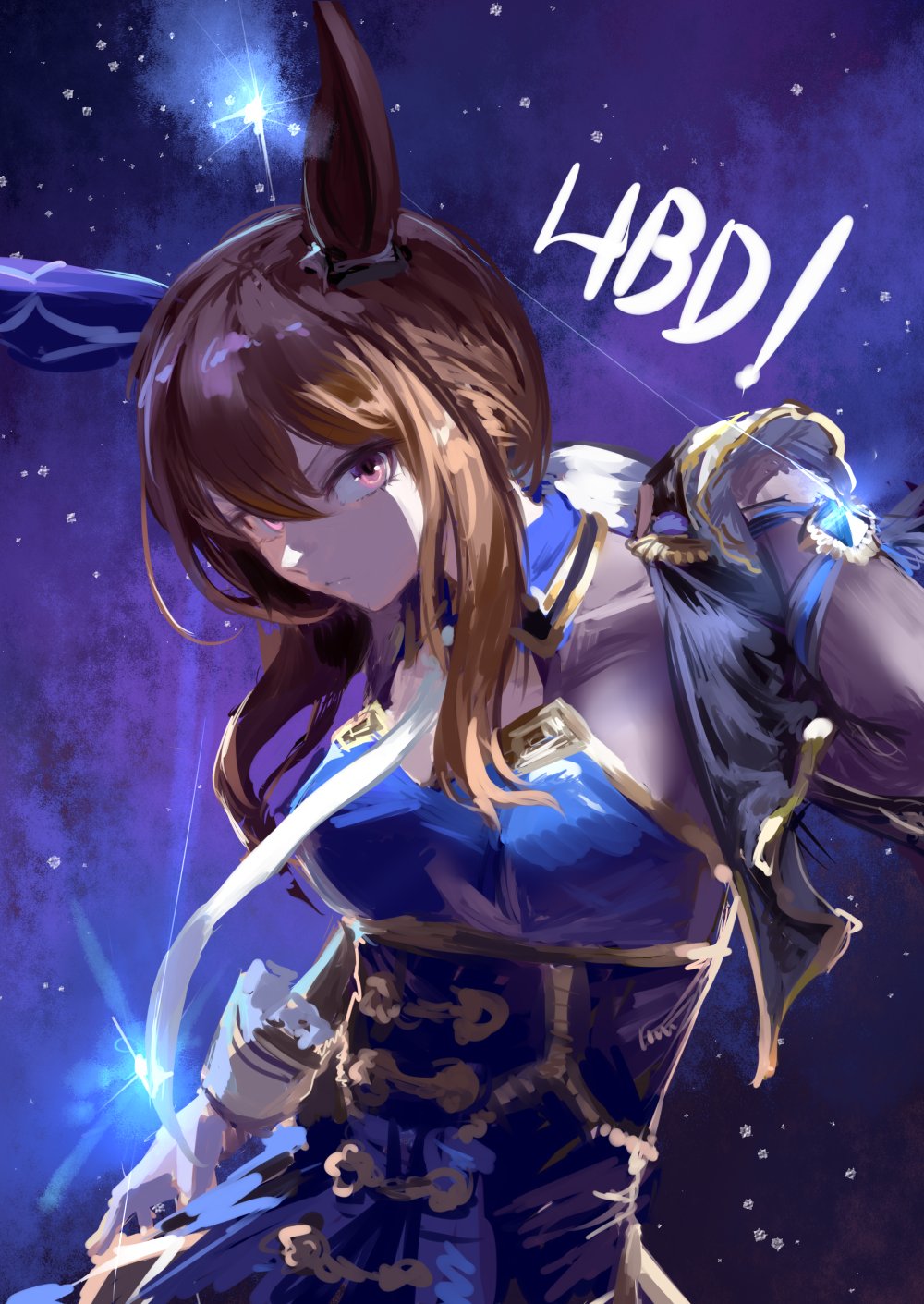 1girl admire_vega_(starry_nocturne)_(umamusume) admire_vega_(umamusume) animal_ears blue_capelet blue_dress bodice breasts brown_hair capelet closed_mouth commentary_request dress ear_covers gloves hair_between_eyes happy highres horse_ears horse_girl horse_tail inishie_kumo long_hair long_sleeves looking_at_viewer low_ponytail necktie ponytail purple_eyes single_ear_cover solo space star_(sky) tail umamusume white_necktie