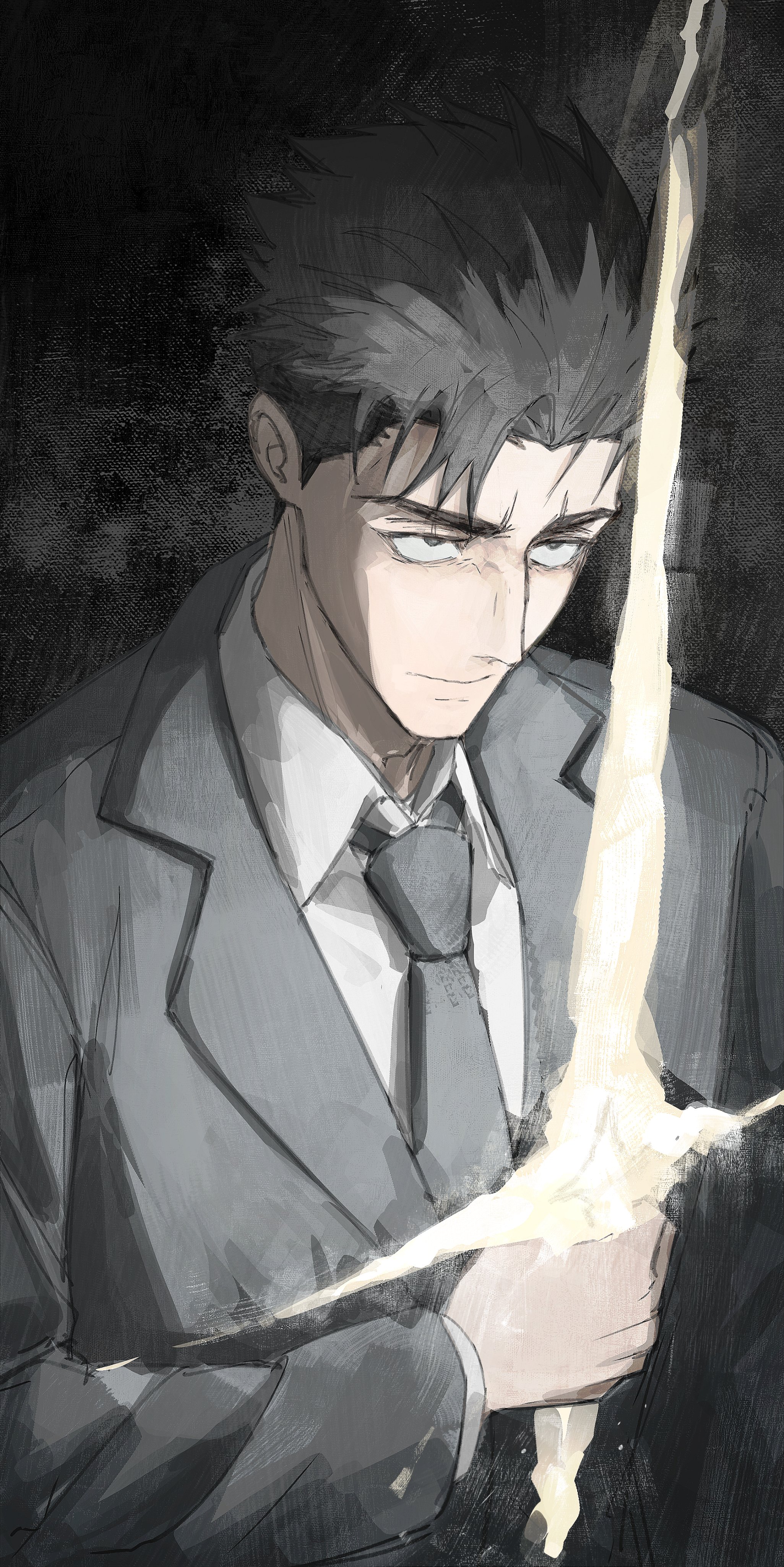 1boy absurdres black_background black_hair closed_mouth collared_shirt commentary grey_jacket grey_necktie highres higuruma_hiromi holding holding_sword holding_weapon jacket jujutsu_kaisen lapels long_sleeves male_focus necktie northystary notched_lapels open_clothes open_jacket sanpaku shirt short_sideburns sideburns solo suit_jacket sword thick_eyebrows upper_body weapon white_shirt wing_collar