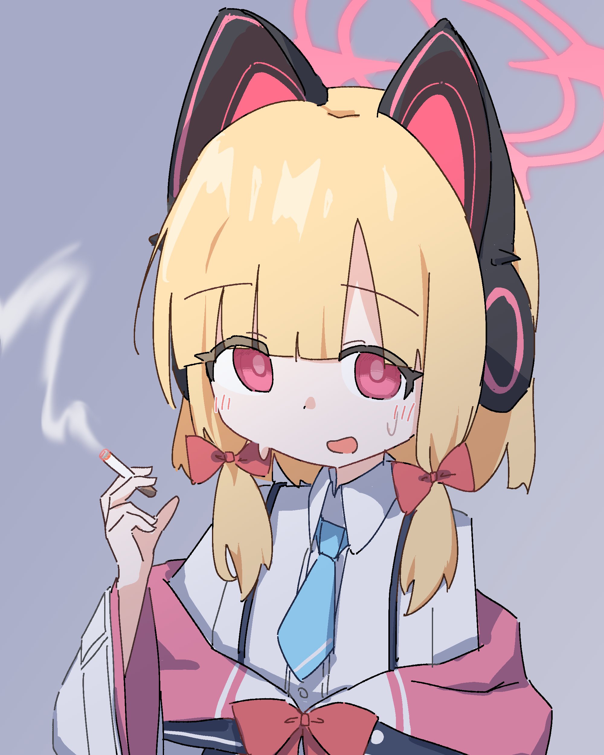 1girl absurdres animal_ear_headphones animal_ears blonde_hair blue_archive blue_necktie bow bowtie cat_ear_headphones cat_ears cigarette collared_shirt fake_animal_ears grey_background hair_bow headphones highres holding holding_cigarette jacket jacket_partially_removed looking_at_viewer medium_hair momoi_(blue_archive) multicolored_jacket necktie pink_jacket red_bow red_bowtie red_eyes shirt smoke smoking solo suspenders sweatdrop two-tone_jacket watanuki_(f41co_) white_jacket white_shirt