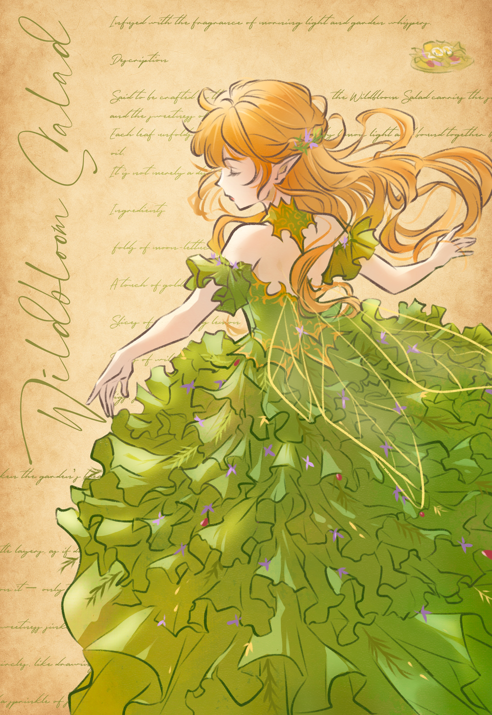 1girl absurdres anabellnordin closed_eyes closed_mouth commentary_request dancing dessert dress elf english_text food frilled_dress frills from_behind green_dress highres long_dress long_hair manuscript_paper off-shoulder_dress off_shoulder original paper pointy_ears recipe solo tagme